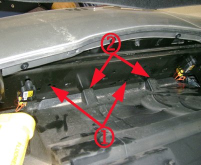 This is a picture of a upper radiator air baffle with a good fit (2) but the bumper beam holes (1) need to be covered with a good adhesive type patch (sound deadener patch) or equivalent. Sound deadener patches can be obtained from Kent Automotive*. Contact Kent Automotive at 1-888-YES-KENT (www.kent-automotive.com) to obtain Kent P/N P20617.