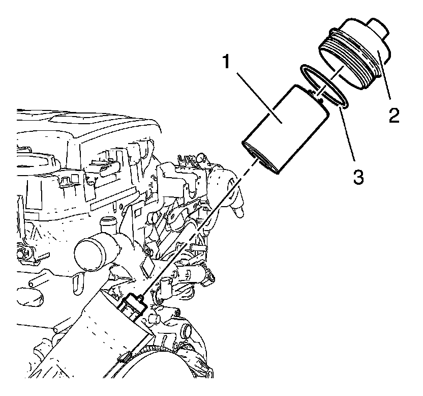3. Remove the engine oil filter cap (2) in compound with the engine oil filter cap seal ring (3) and the oil filter element (1).