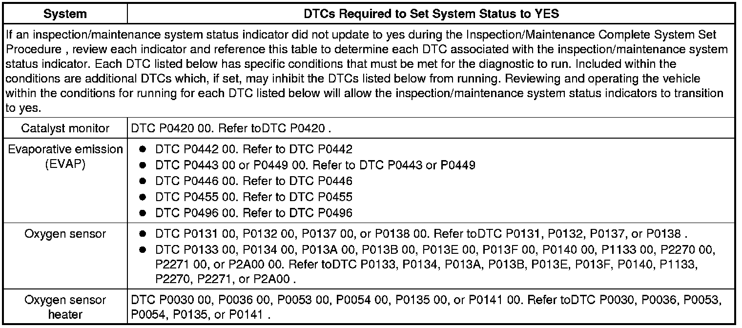 Inspection/Maintenance (I/M) Test DTC Table