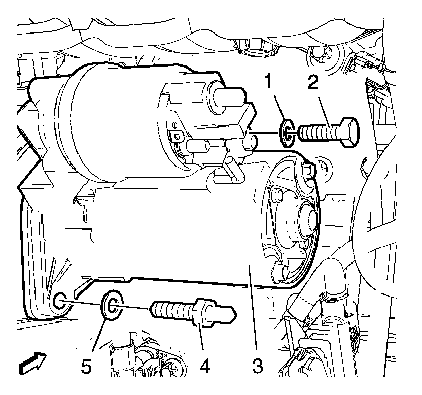 2. Install the washer (5) and the starter bolt stud (4) and tighten to 25 Nm (18 lb ft).