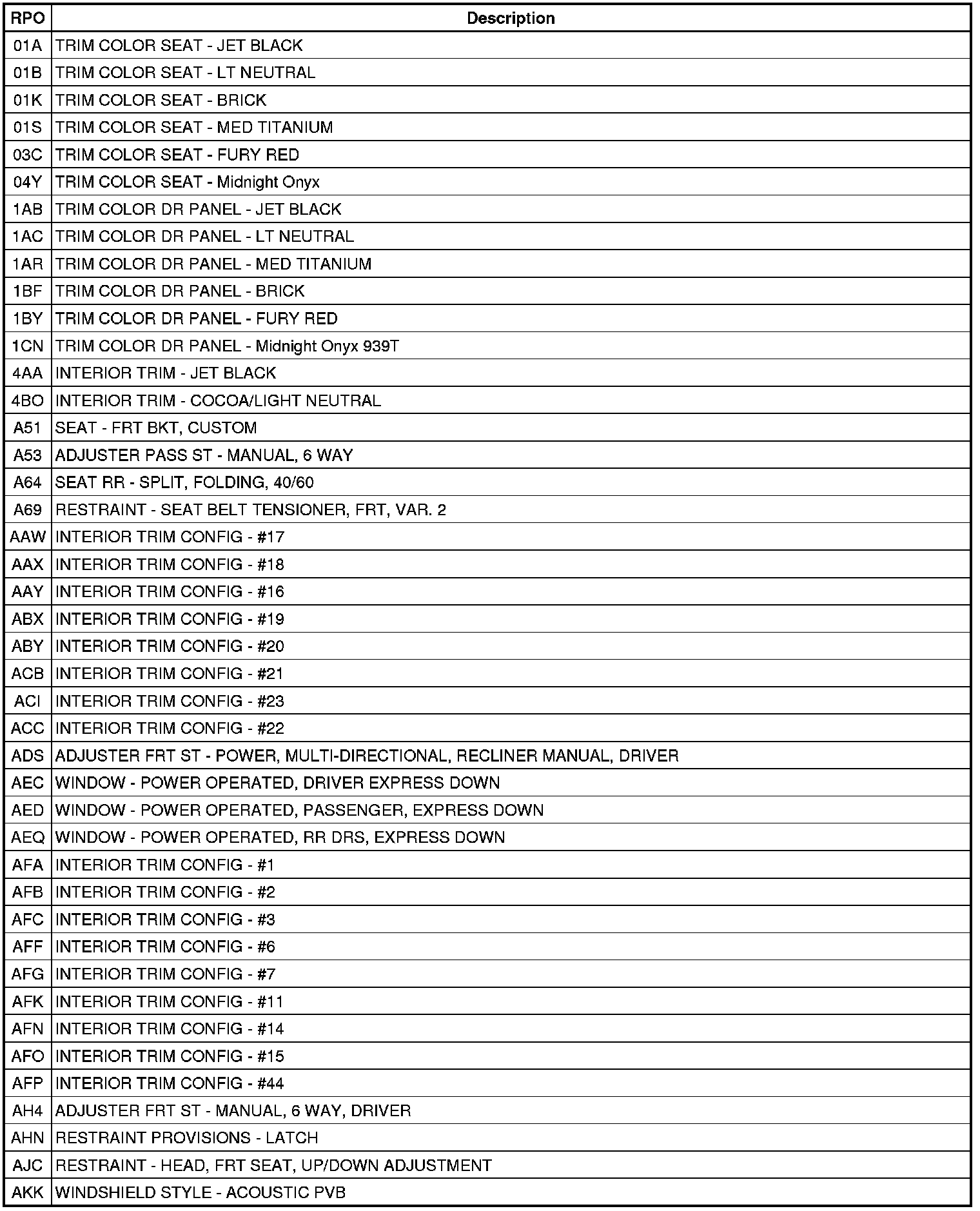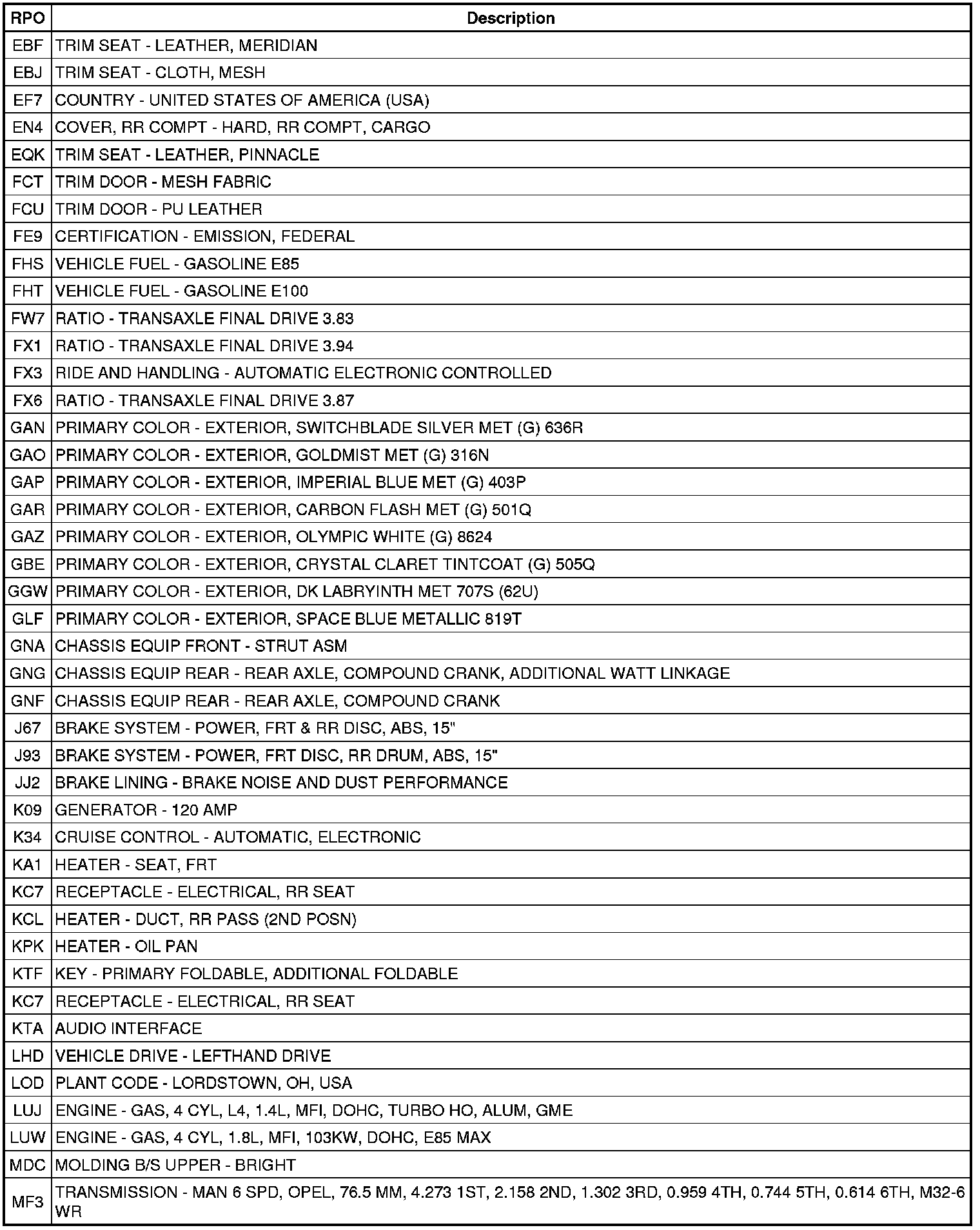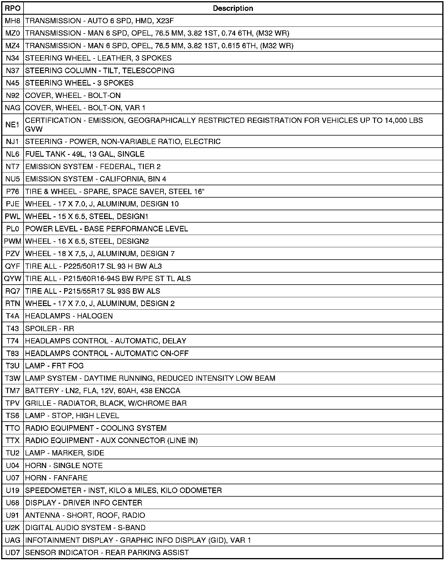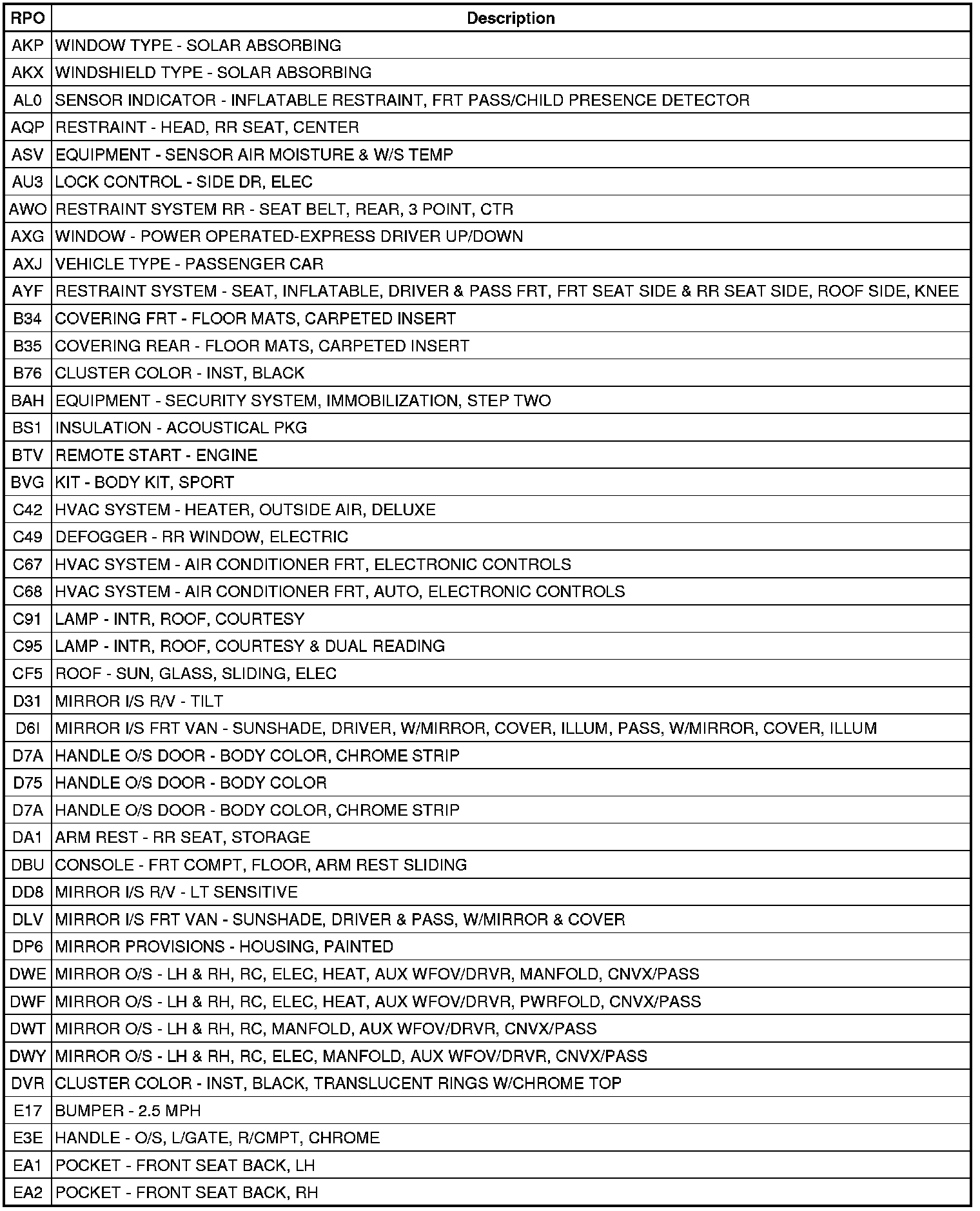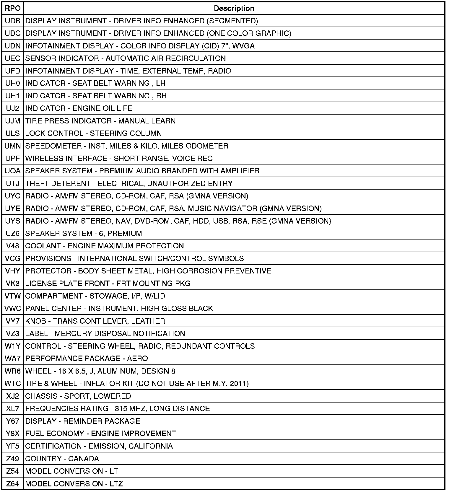 The following table provides the description of the Regular Production Option (RPO) codes that are available on the vehicle. The vehicle's RPO list is printed on the Service Parts Identification Label.