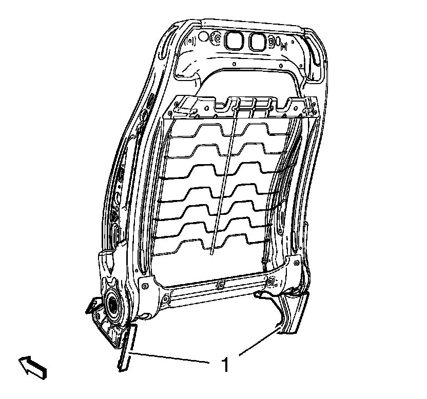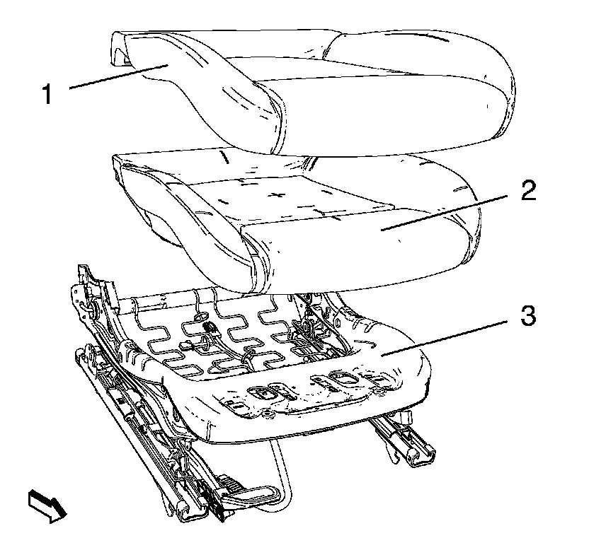 3. Remove front seat back cushion cover (1) and pad (2) from frame (3). Refer to Driver or Passenger Seat Back Cushion Cover and Pad Replacement (Driver or Passenger Seat Back Cushion Cover and Pad Replacement)