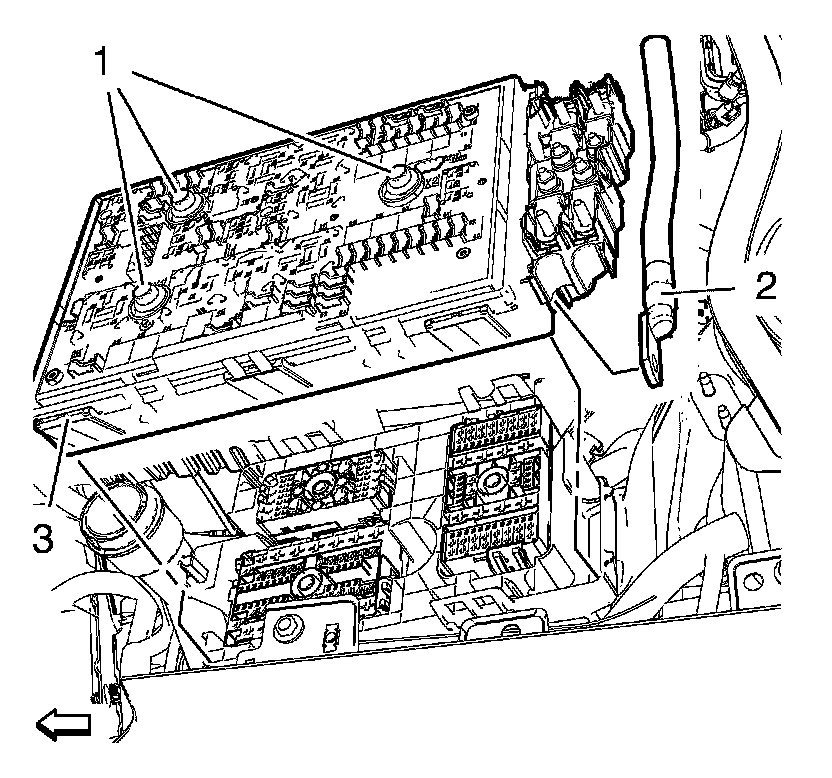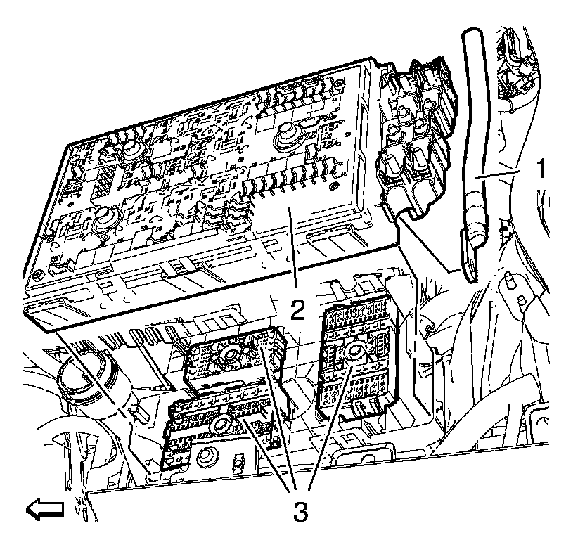 4. Unlock retaining tabs and remove the front compartment fuse block (3).