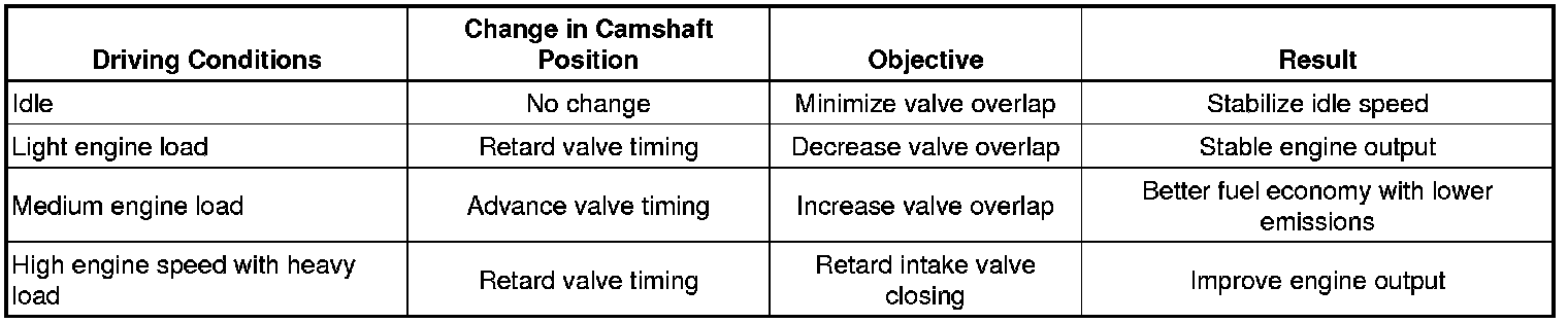 The ECM can also command the camshaft position actuator solenoid valve - intake and camshaft position actuator solenoid valve - exhaust to stop oil flow from both passages in order to hold the current camshaft position. The ECM is continuously comparing camshaft position sensor - intake and camshaft position sensor - exhaust input with camshaft position actuator solenoid valve - intake and camshaft position actuator solenoid valve - exhaust input in order to monitor camshaft position and detect any system malfunctions. The following table provides camshaft phase commands for common driving conditions: