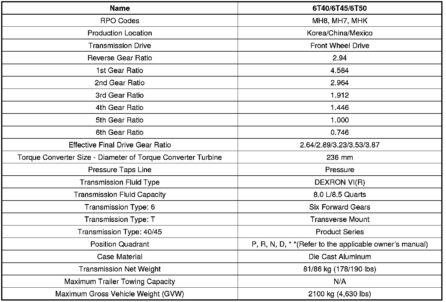 Transmission General Specifications (6T40/45/50)