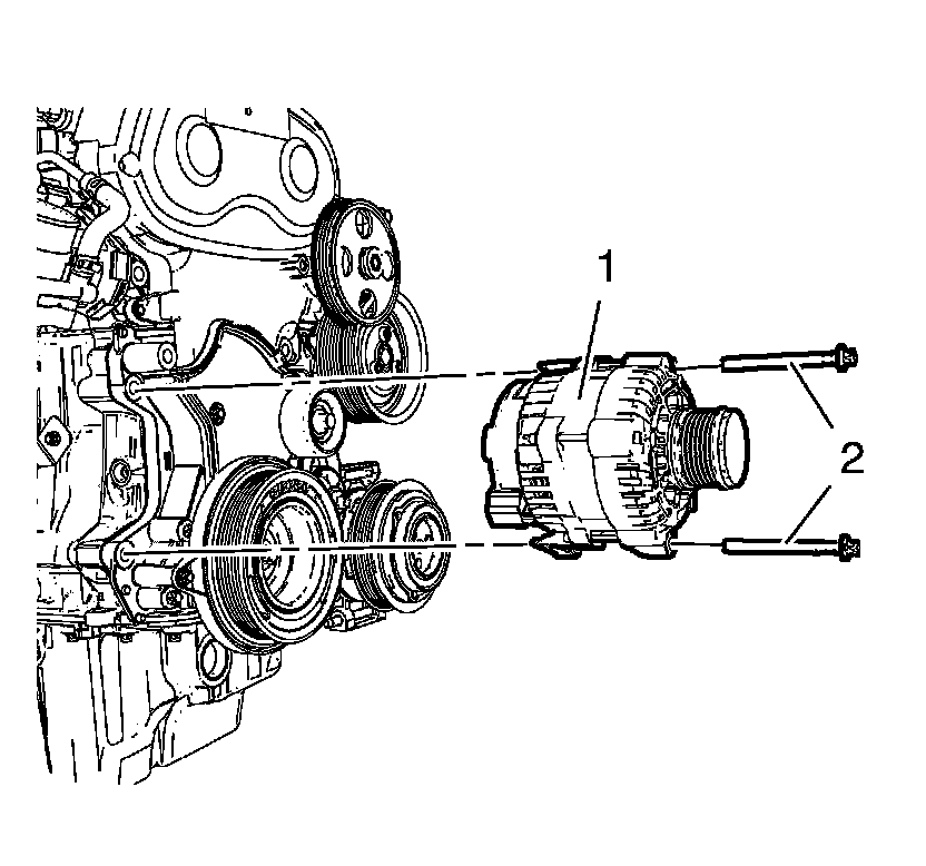 2. Install the 2 generator bolts (2) and tighten to 35 Nm (26 lb ft).