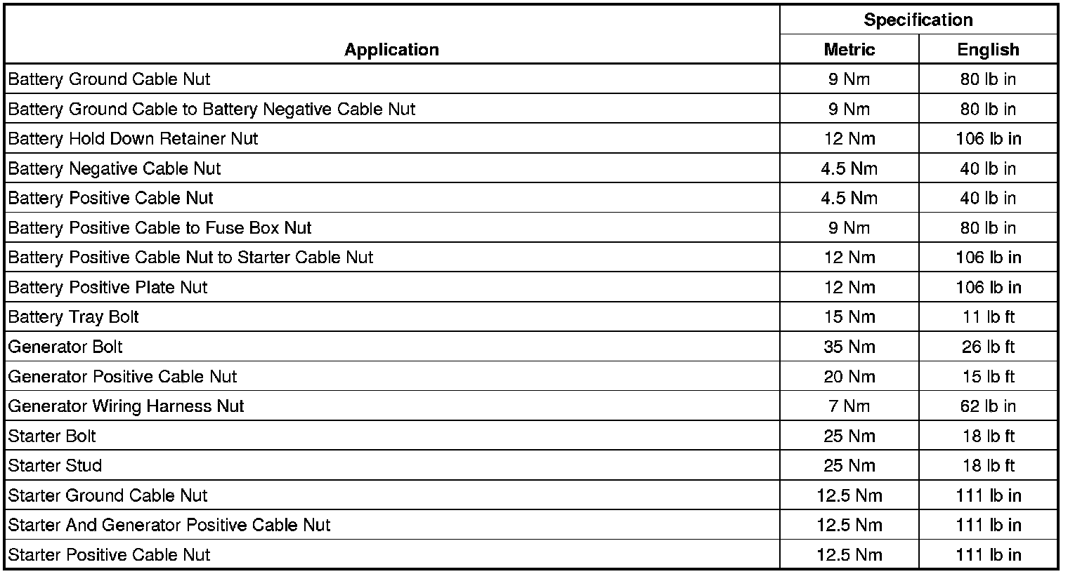 Starting and Charging: Specifications