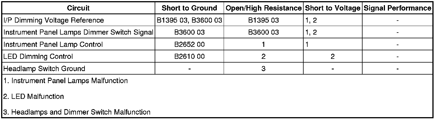 The body control module (BCM) supplies a voltage reference through the instrument panel (I/P) dimming voltage reference circuit to the interior lamp dimmer switch, which is part of the headlamp switch. When the dimmer switch is placed in a desired brightness position, reference voltage is applied through the dimmer switch rheostat and the I/P lamps dimmer switch signal circuit to the BCM. The BCM interprets this voltage signal, then applies a pulse width modulated (PWM) voltage from the CHMSL/BCK-UP fuse through the instrument panel lamp supply voltage circuit, the backlight lamp control circuit, and the LED dimming supply circuit illuminating the LED and I/P panel lamps.