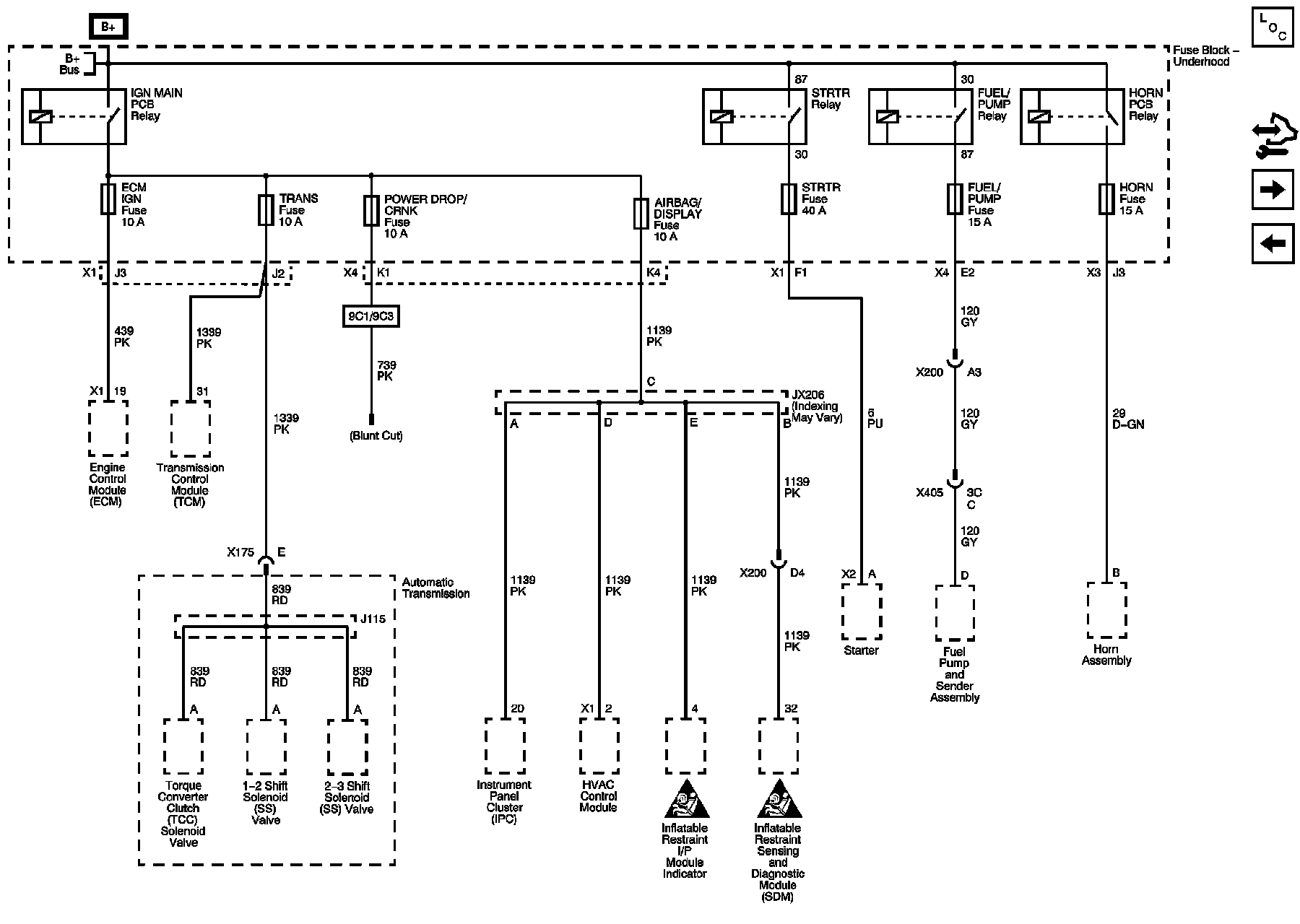 ECM IGN, TRANS, PWR DROP/CRNK, AIRBAG/DISPLAY, STRTR, FUEL/PUMP, and HORN Fuses