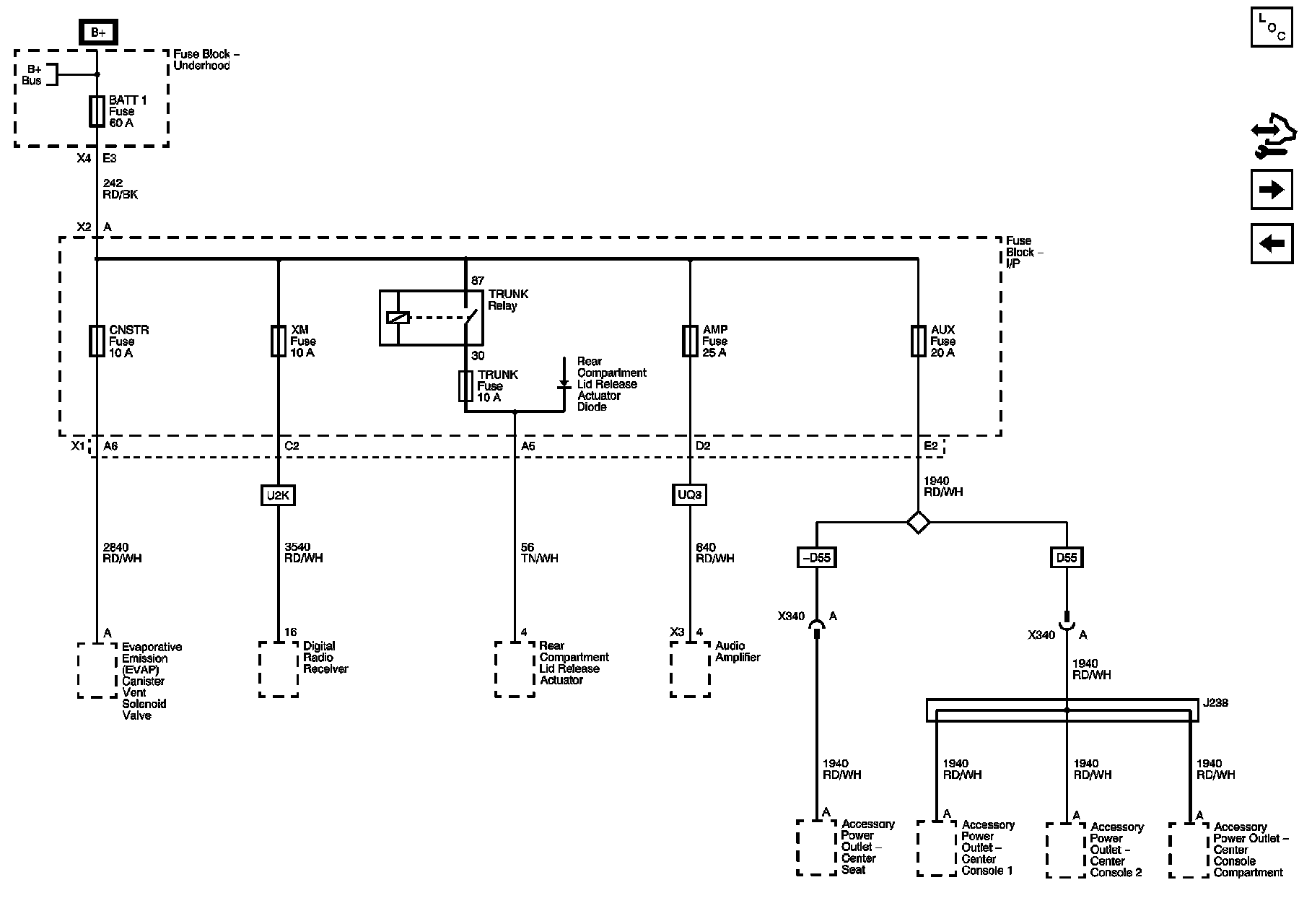 BATT 1, CNSTR, XM, TRUNK, AMP, AUX Fuses, and TRUNK Relay