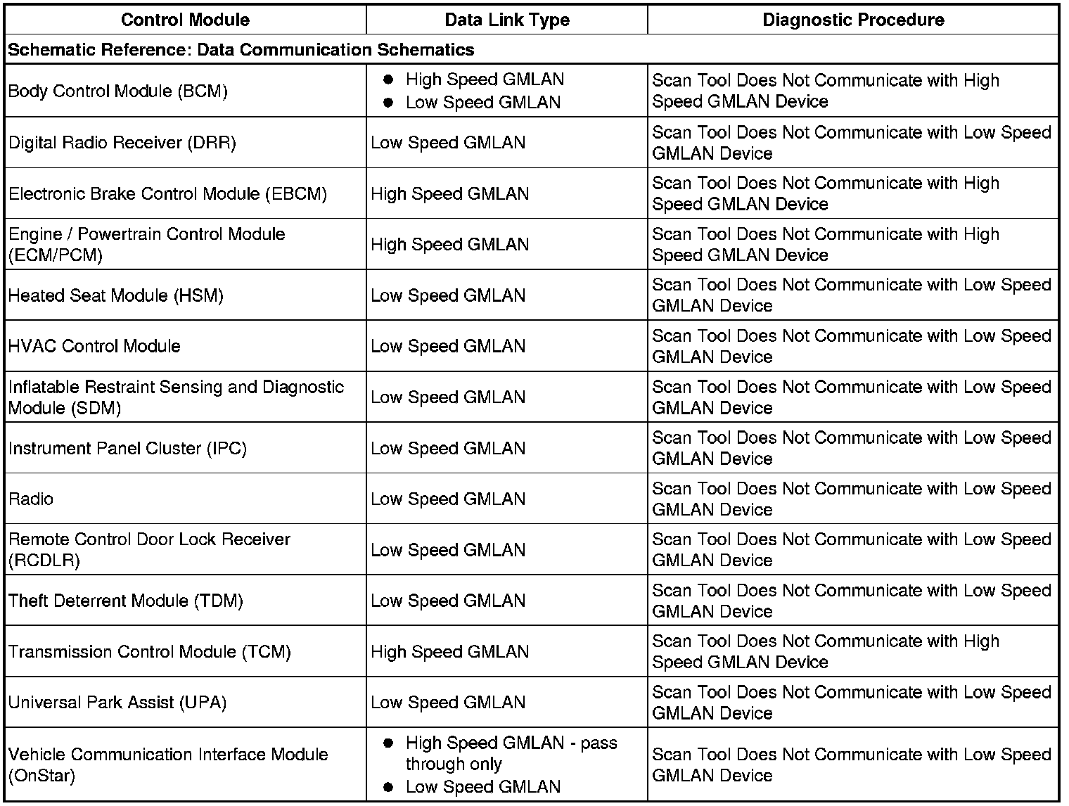 This table identifies which serial data link that a particular module uses for in-vehicle data transmission. Some modules may use more than one data link to communicate. Some modules may have multiple communication circuits passing through them without actively communicating on that data link. This table is used to assist in correcting a communication malfunction. For the description and operation of these serial data communication circuits refer to Data Link Communications Description and Operation (Description and Operation).