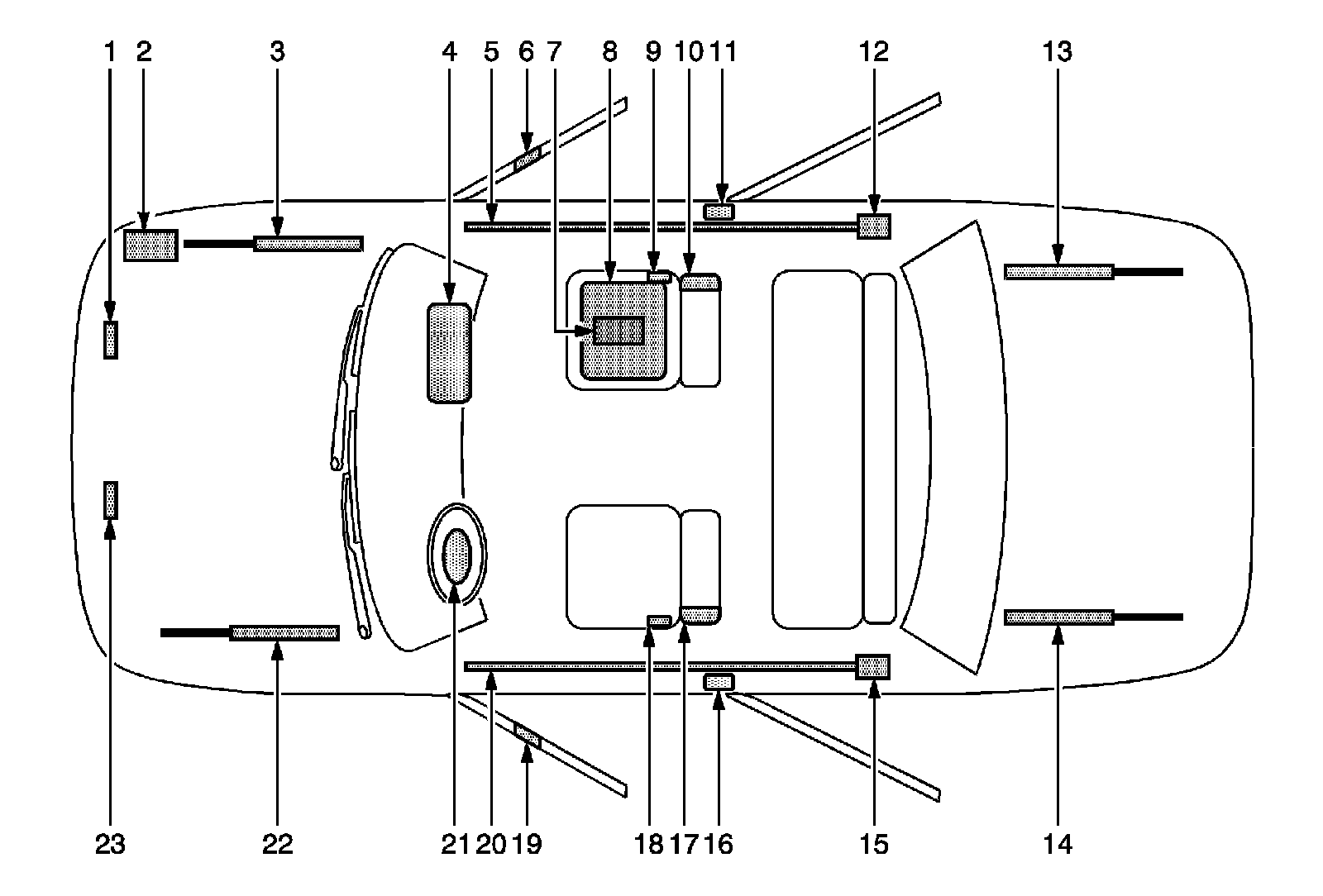 The SIR Identification Views shown below illustrate the approximate location of all SIR components available for the vehicle. This will assist in determining the appropriate SIR Disabling and Enabling for a given service procedure, refer to SIR Disabling and Enabling (Service and Repair).
