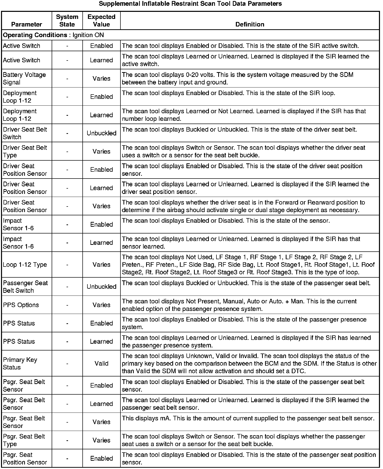 Inflatable Restraint Sensing and Diagnostic Module Scan Tool Information