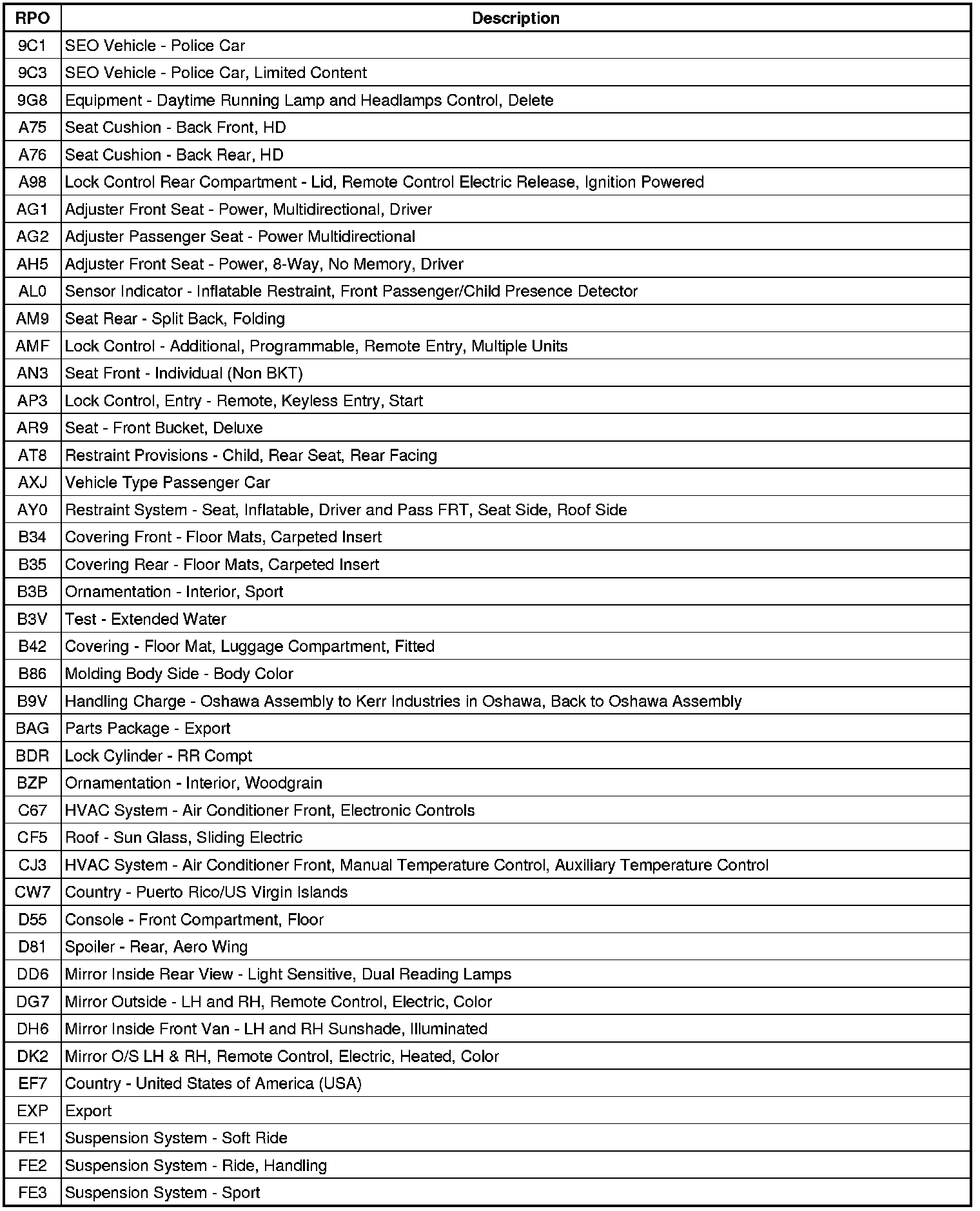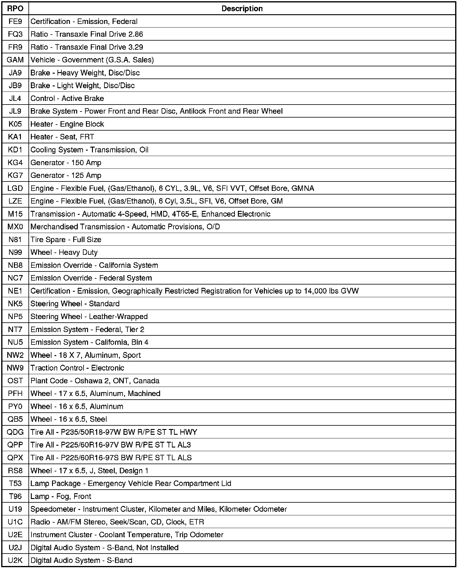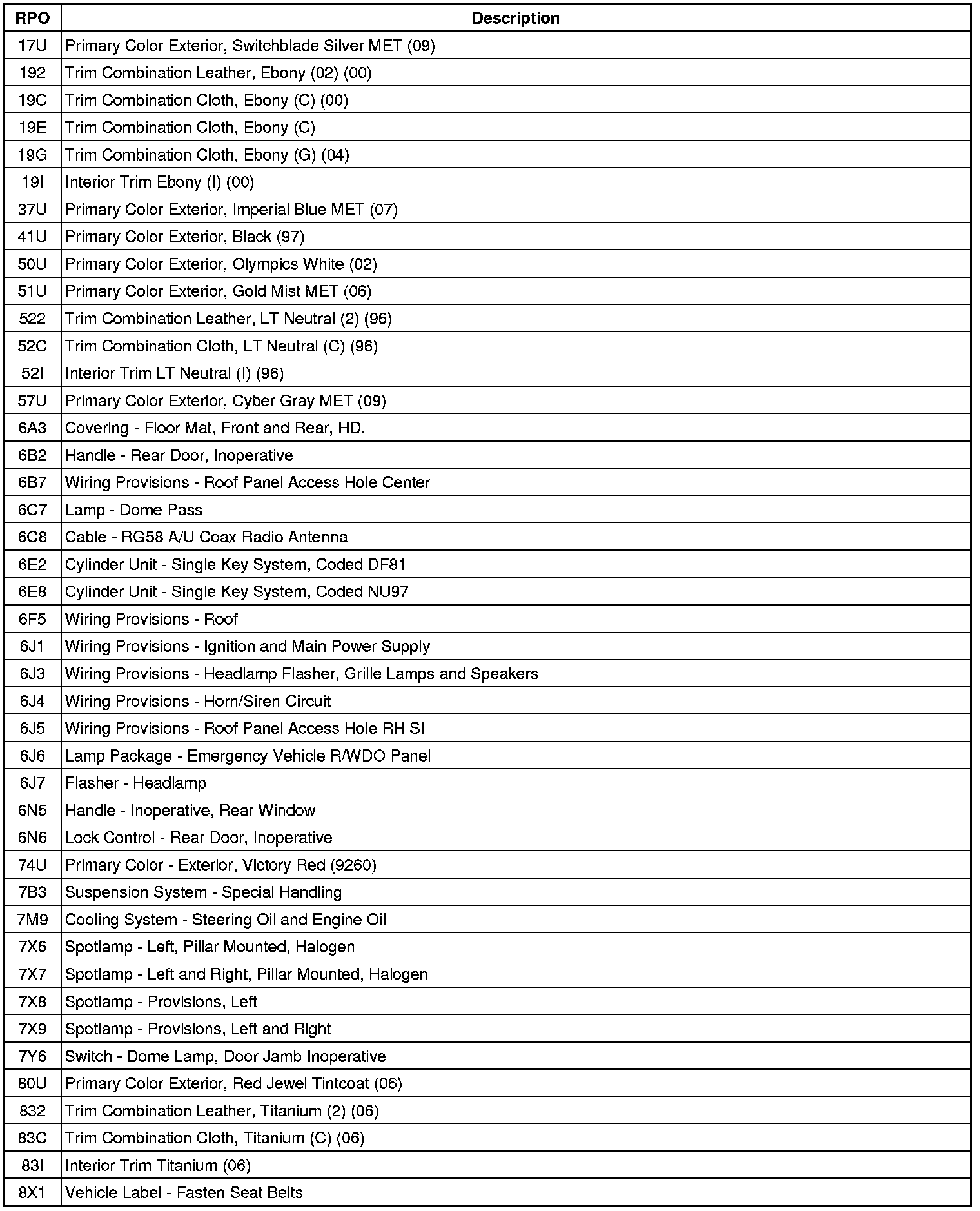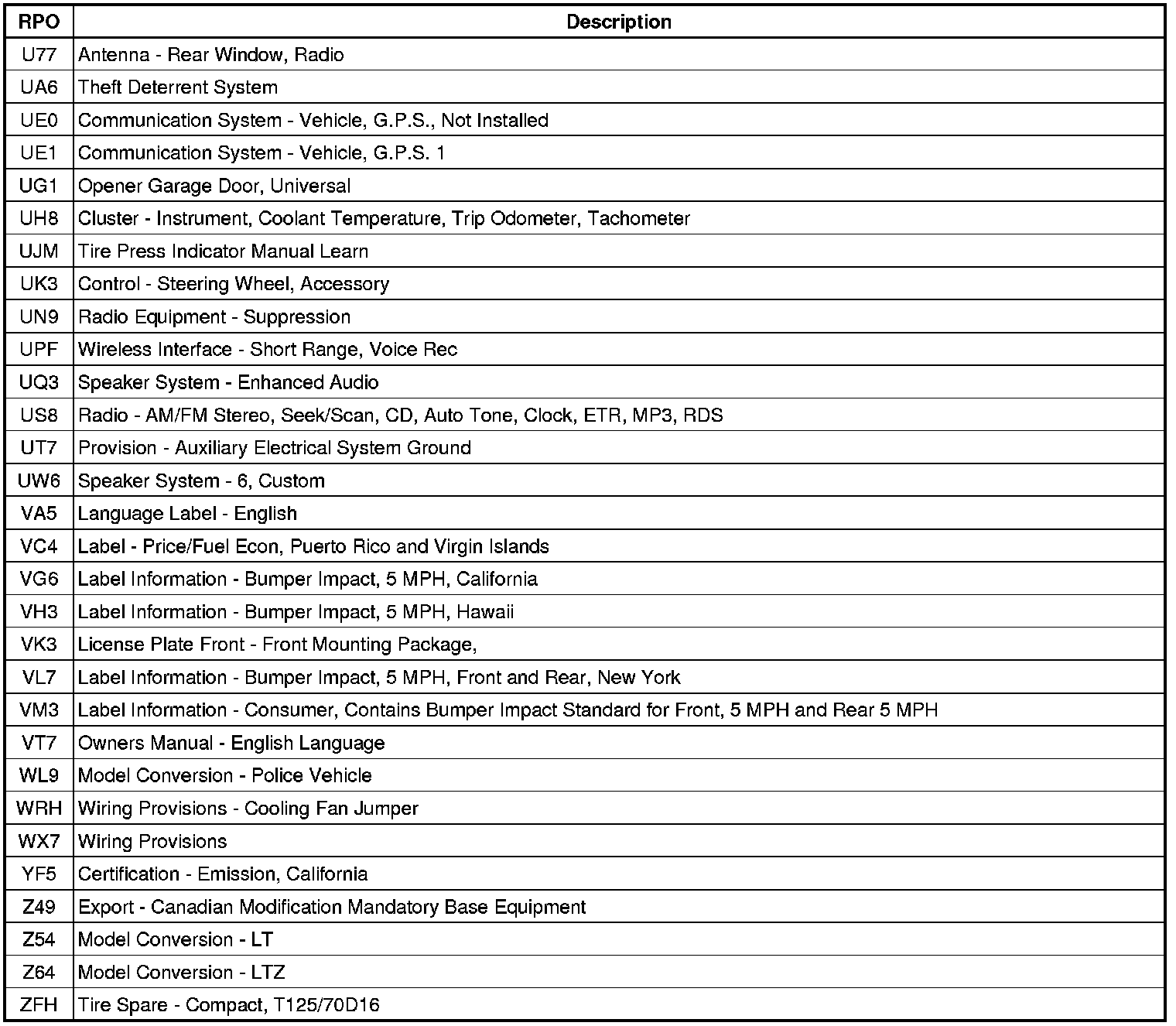 The following table provides the description of the Regular Production Option (RPO) codes that are available on the vehicle. The vehicle's RPO list is printed on the Service Parts Identification Label.