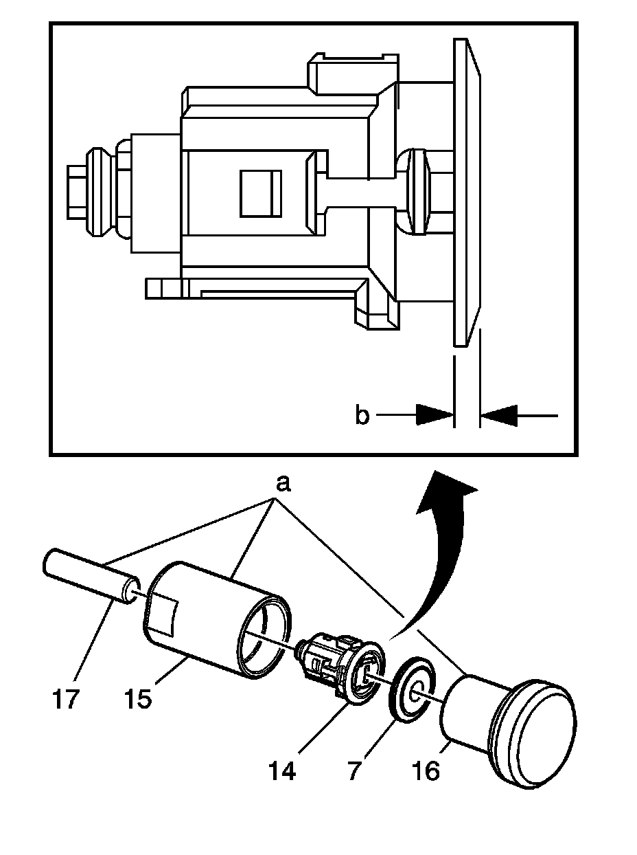 16. Stake the cap (7) onto the head of the case (4) by using the appropriate staking tool BO-48370 . Ensure proper orientation and set the cylinder assembly (14), (which includes the case (4), coded cylinder (1), shutter springs (5), and shutter assembly (6)) and the cap (7) into the staking cup (15) and clamp into vise. Remove any debris and install the cleaned staking ram (16) into staking cup (15) and with a dead blow hammer, hit the staking ram (16) with moderate force 2 or 3 times. Check to determine if cap is securely staked to the cylinder assembly (14). Repeat previous step until cap is securely staked to the cylinder assembly. Remove assembly from the staking cup (15). If necessary, insert the removal punch (17) into the opposite end of the staking cup and tap lightly. Confirm that the shutter springs (5) push the shutter assembly (6) up against the inside surface of the cap (7).
