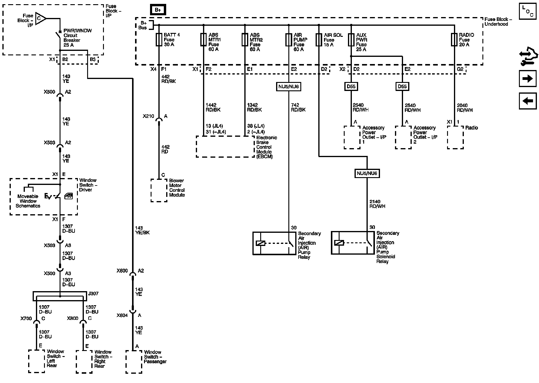 BATT 4, ABS MTR1, ABS MTR2, AIR PUMP, AIR SOL, AUX PWR, Radio Fuses, and PWR/WNDW Circuit Breaker