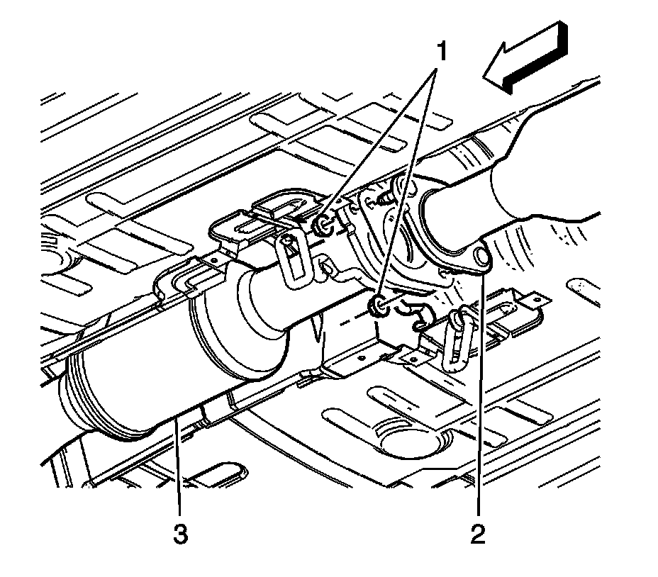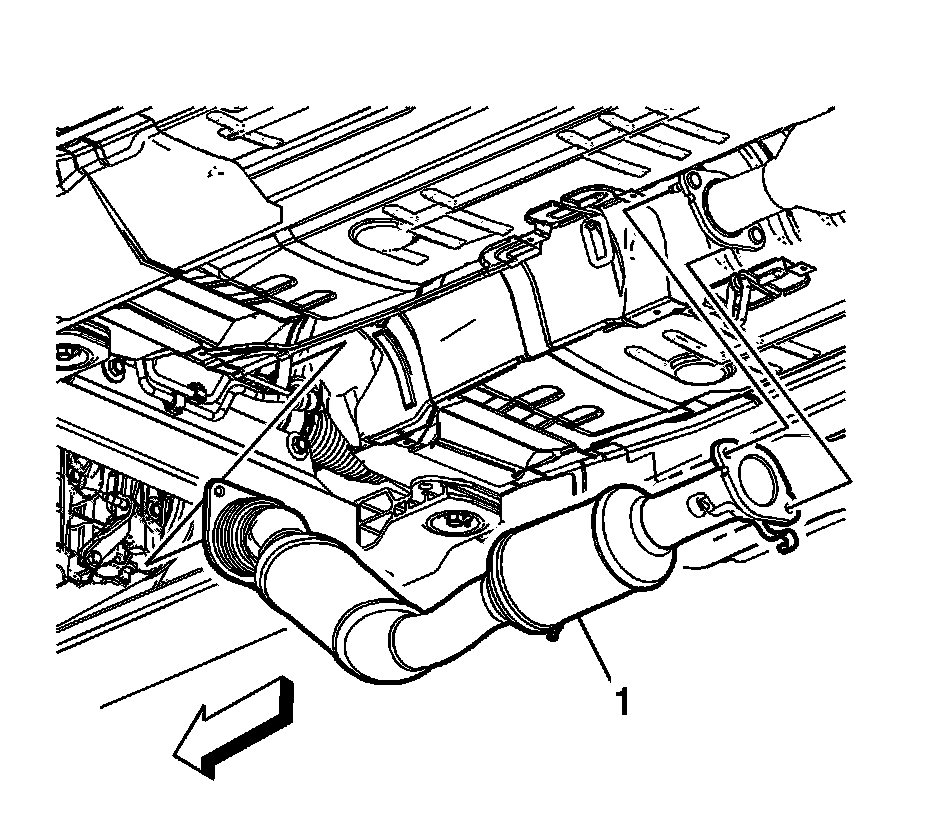 2. Reposition the muffler assembly rearward in order to position the catalytic converter (1) to the exhaust Manifold and muffler assembly.