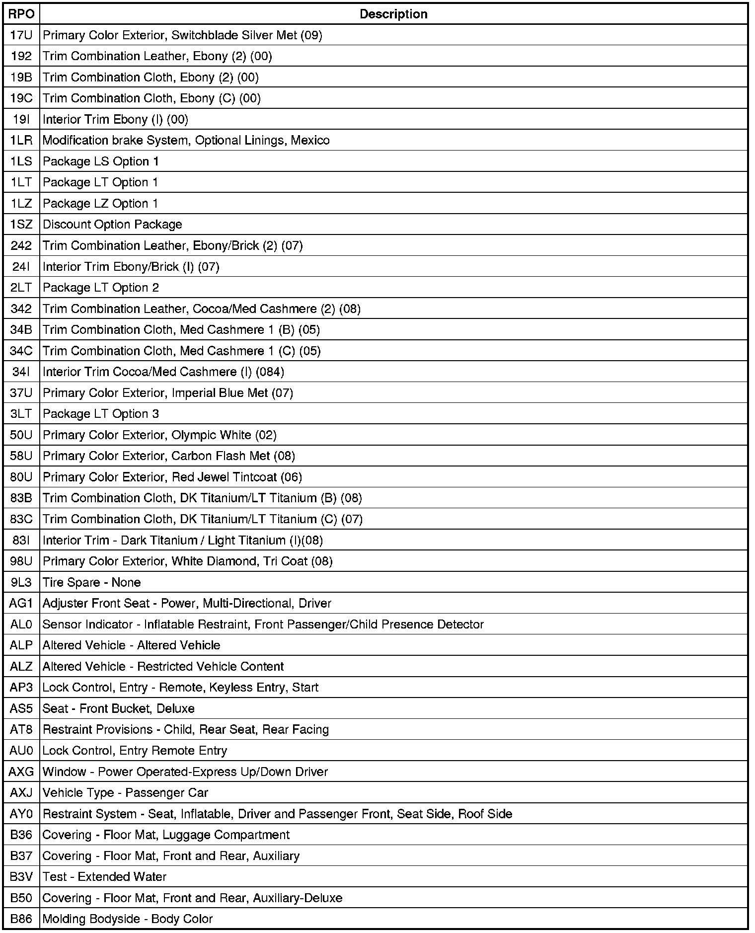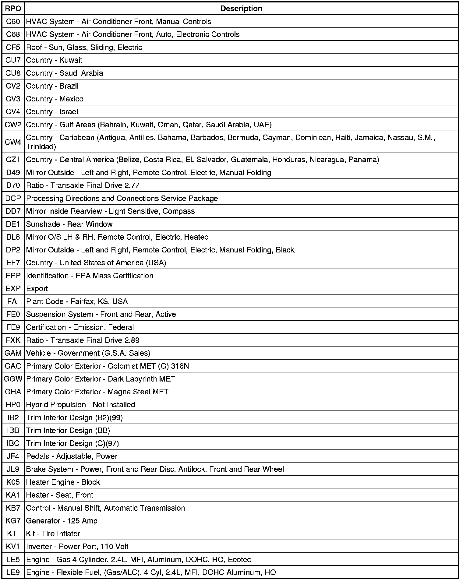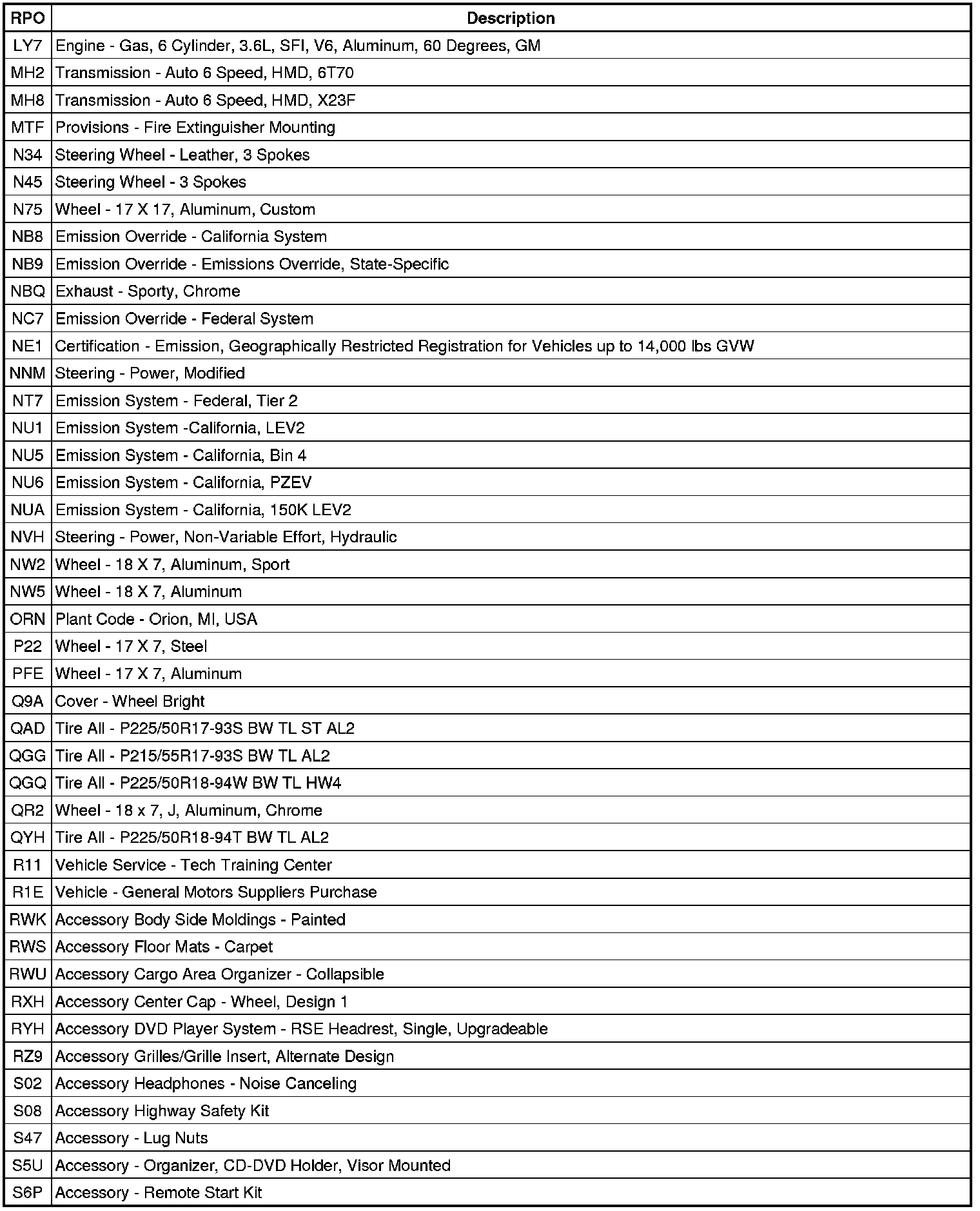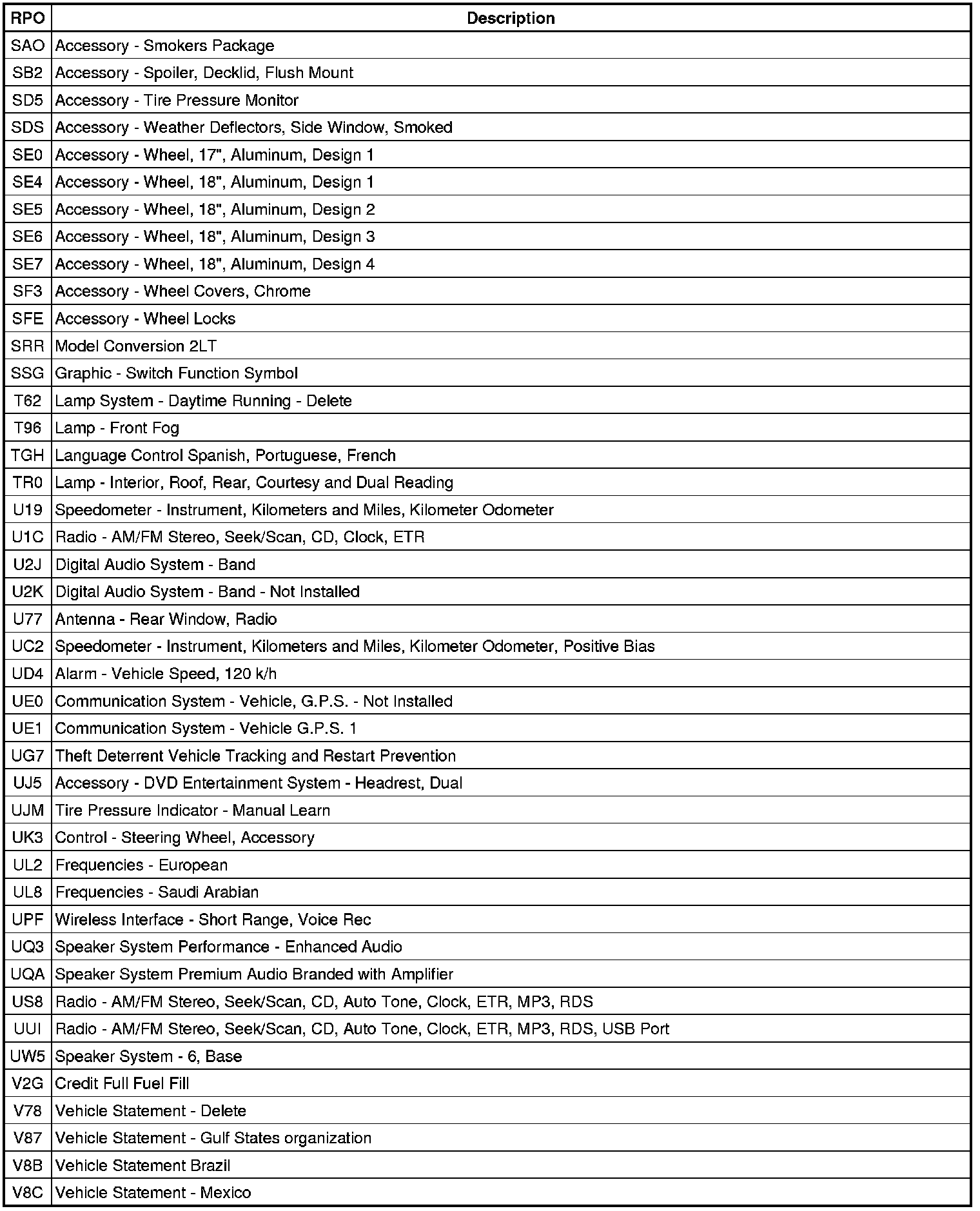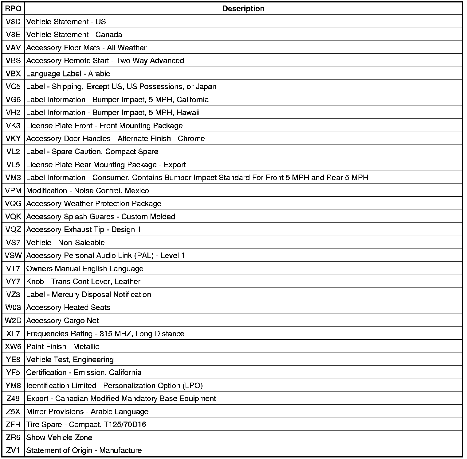 The following table provides the description of the Regular Production Option (RPO) codes that are available on the vehicle. The vehicle's RPO list is printed on the Service Parts Identification Label.