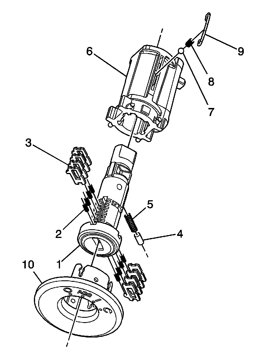 14. With the cylinder assembly in the Off-Lock position, insert the detent ball (7), and detent spring (8) into the hole in the side of the case assembly (6). Install the anti-rattle spring (9) into the case assembly over the detent spring. The anti-rattle spring should capture the detent ball and spring in the case assembly. Make sure both ends of the anti-rattle spring (9) are fully seated, pressed into, the case assembly.