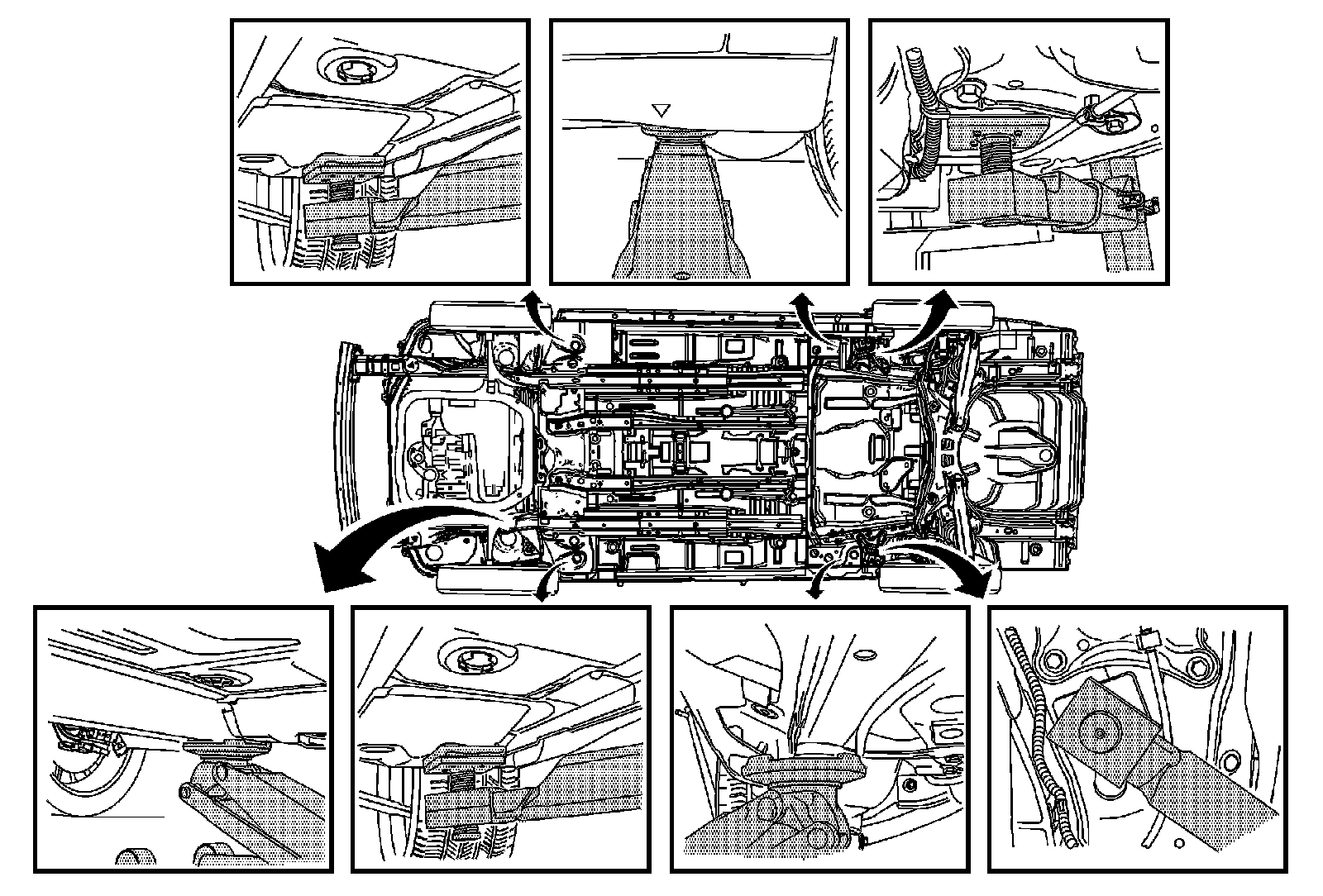 When using a service jack under the front of the vehicle use one of the following locations: