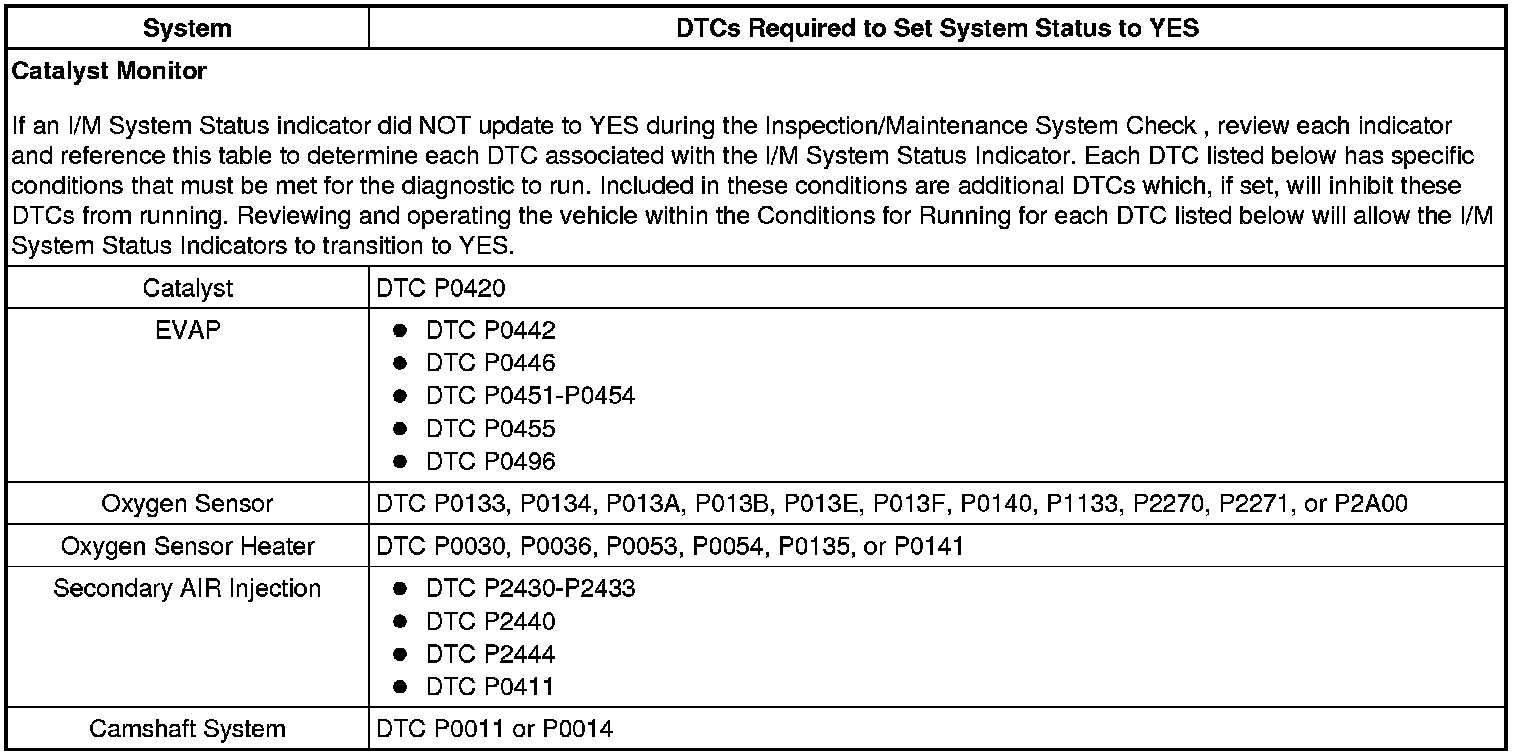Inspection/Maintenance (I/M) Test DTC Table