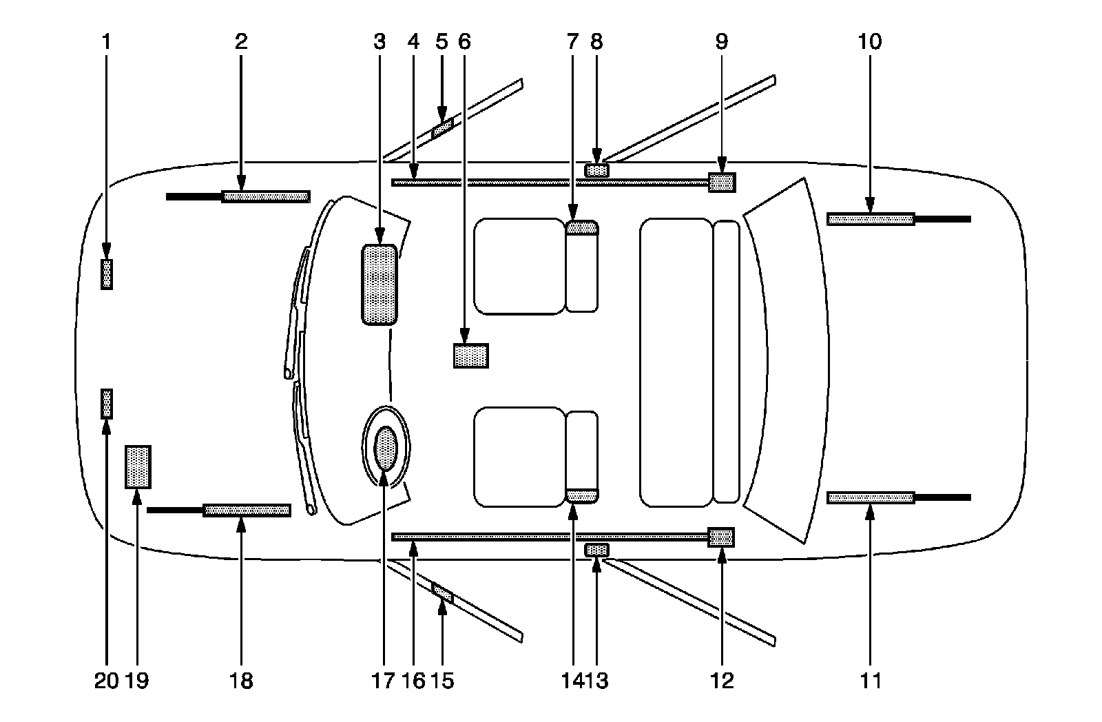 4 - Right Roof Rail Air Bag-Located under the headliner, extending from the passenger front windshield pillar to the passenger rear windshield pillar