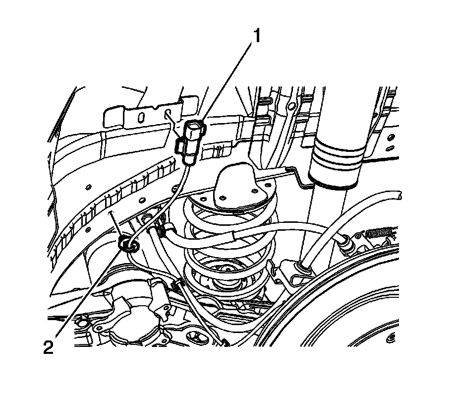 8. Release the wheel speed sensor harness retainer (2) from the frame rail and remove the wheel speed sensor.