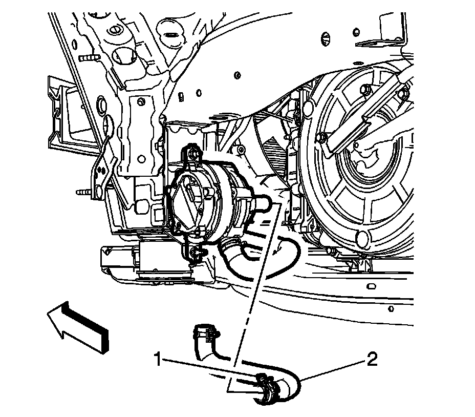 2. Install the drive motor generator control module coolant pump hose (2) to the drive motor battery coolant air separator.