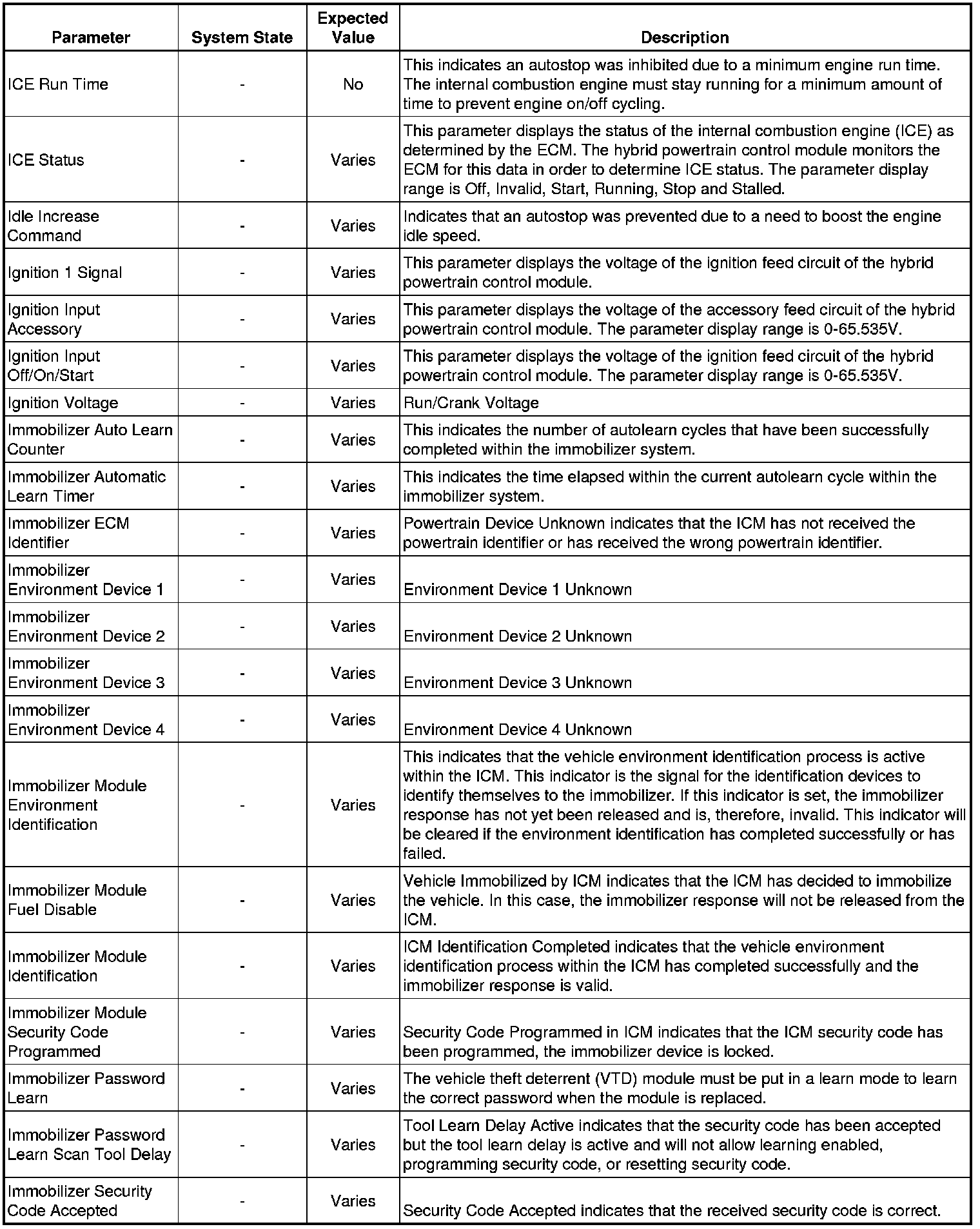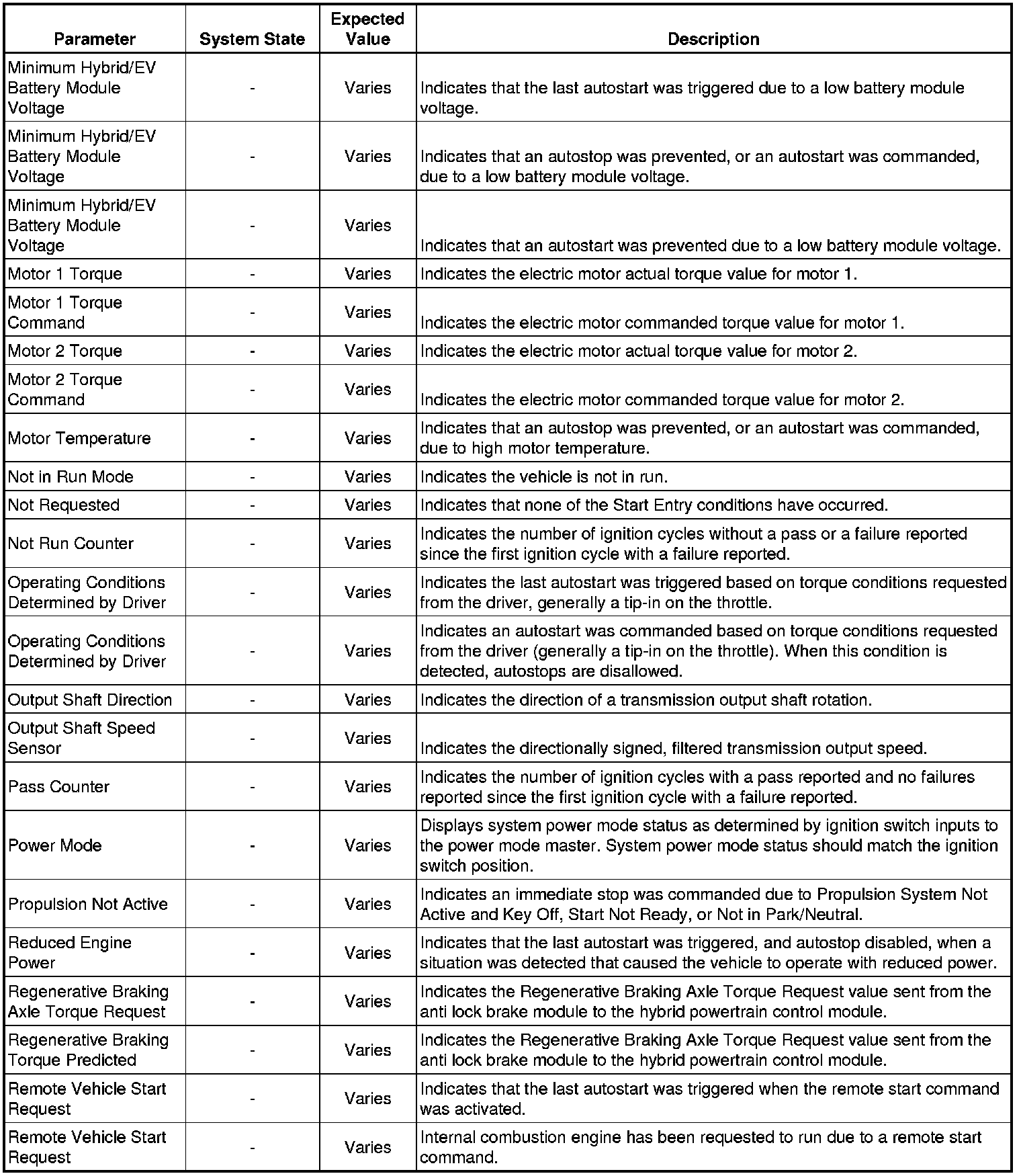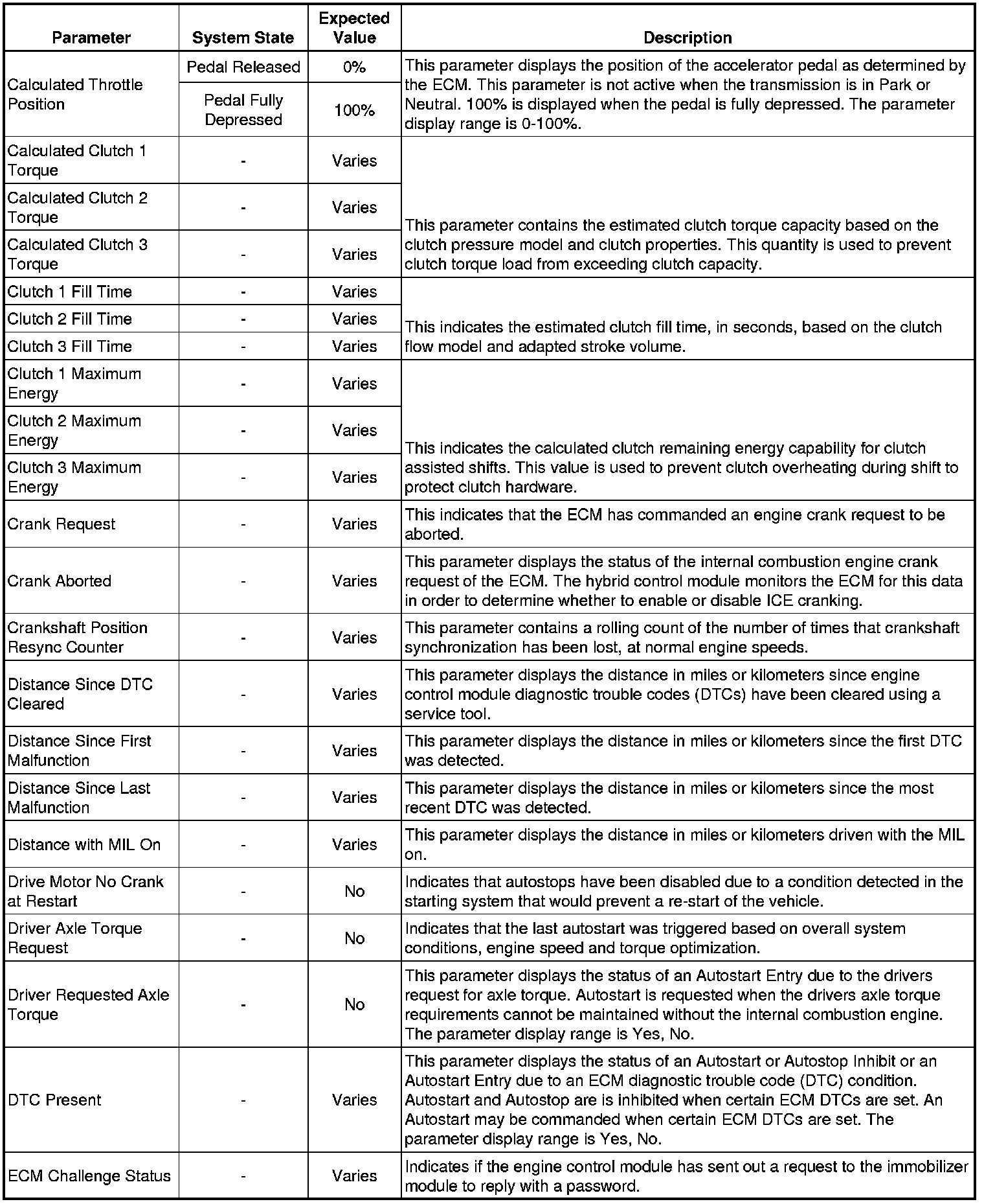 The scan tool values from a properly running vehicle may be used for comparison with the vehicle you are diagnosing. The Hybrid Powertrain Control Module Scan Tool Data Parameters list represents values that would be seen on a normally running vehicle.