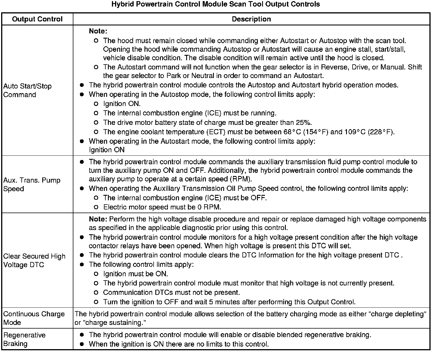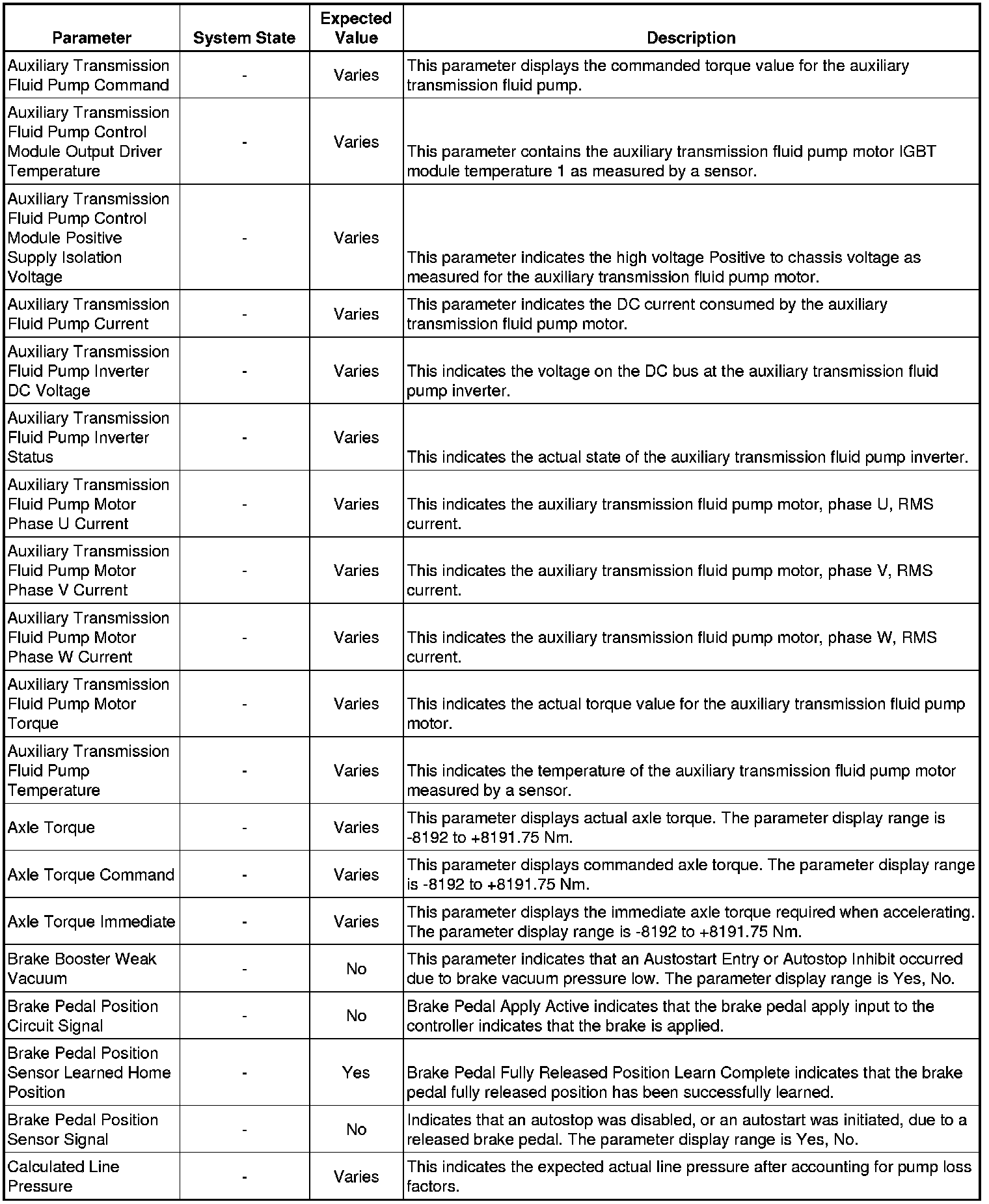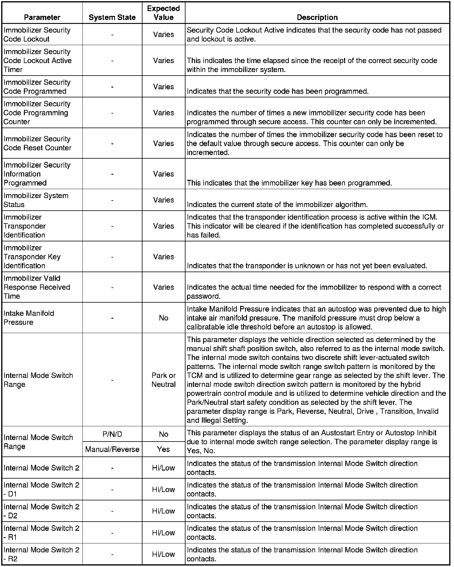 The scan tool values from a properly running vehicle may be used for comparison with the vehicle you are diagnosing. The Hybrid Powertrain Control Module Scan Tool Data Parameters list represents values that would be seen on a normally running vehicle.