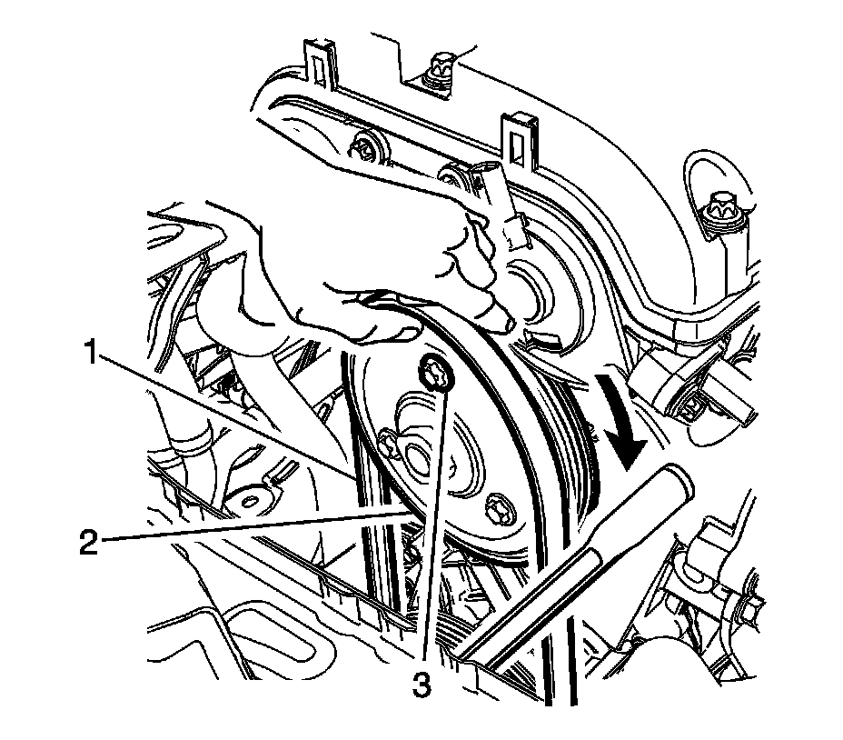 Note: Position the water pump pulley (2) as shown. The position of the pulley bolts (3) will help prevent the belt from catching on the bolts and provide ease of installation.