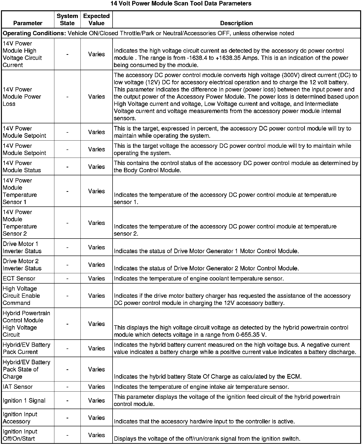 The accessory DC power control module is also referred to as the 14 volt power module. The Accessory DC Power Control Module Scan Tool Data Parameters list contains hybrid controls-related parameters. The list is arranged in alphabetical order.