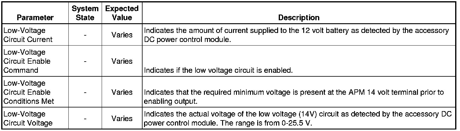 The scan tool values from a properly running vehicle may be used for comparison with the vehicle you are diagnosing. The Accessory DC Power Control Module Scan Tool Data Parameters list represents values that would be seen on a normally running vehicle.