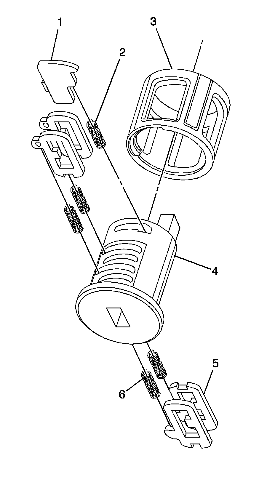 4. Rotate the cylinder assembly. Insert the tumbler spring (6) into each of the spring pockets of the cylinder assembly. This side uses right tumblers.