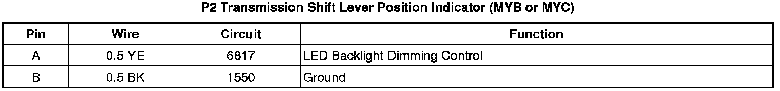 P2 Transmission Shift Lever Position Indicator (MYB or MYC)