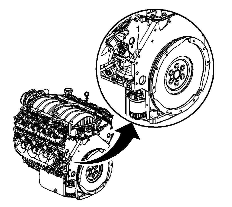 The vehicle identification number (VIN) (1) is located on the left side rear of the engine block and is typically a 9 digit number stamped or laser-etched onto the engine at the vehicle assembly plant.
