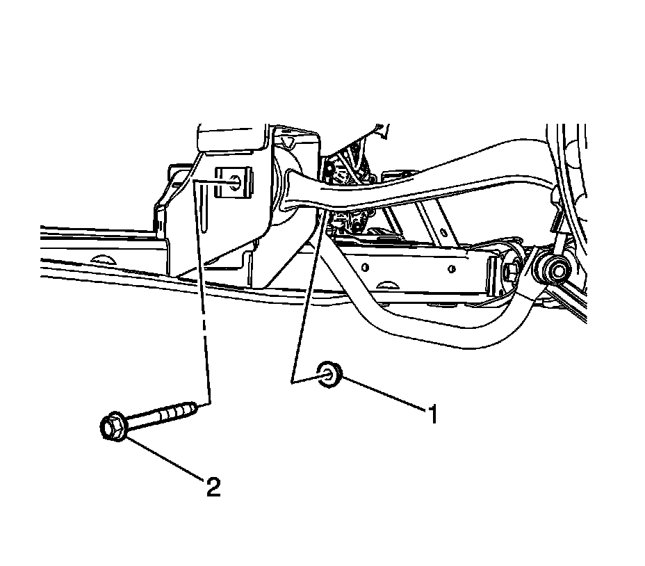 2. Install the front lower control arm bolt (2) and the nut (1).