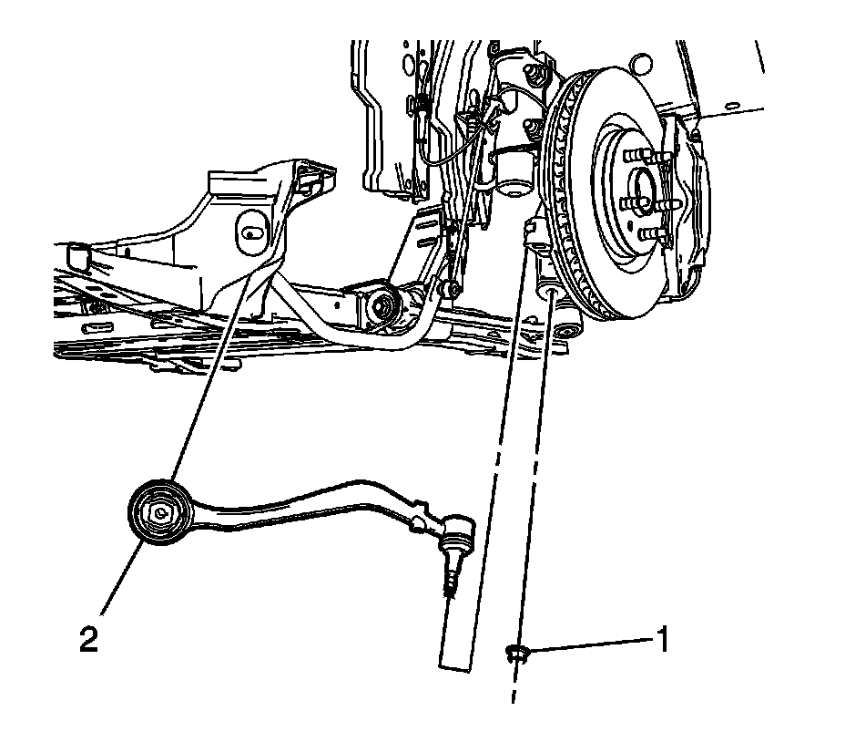 6. Remove the front lower control nut (1) and the control arm (2) from the frame and the steering knuckle.