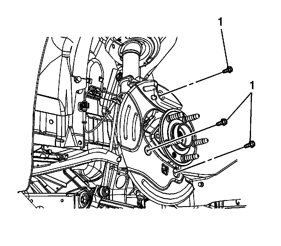 3. Remove the front disc brake rotor (1). Refer to Front Brake Rotor Replacement (LFX) Front Brake Rotor ReplacementFront Brake Rotor Replacement (L99, LS3) Front Brake Rotor ReplacementFront Brake Rotor Replacement (LSA) Front Brake Rotor Replacement.