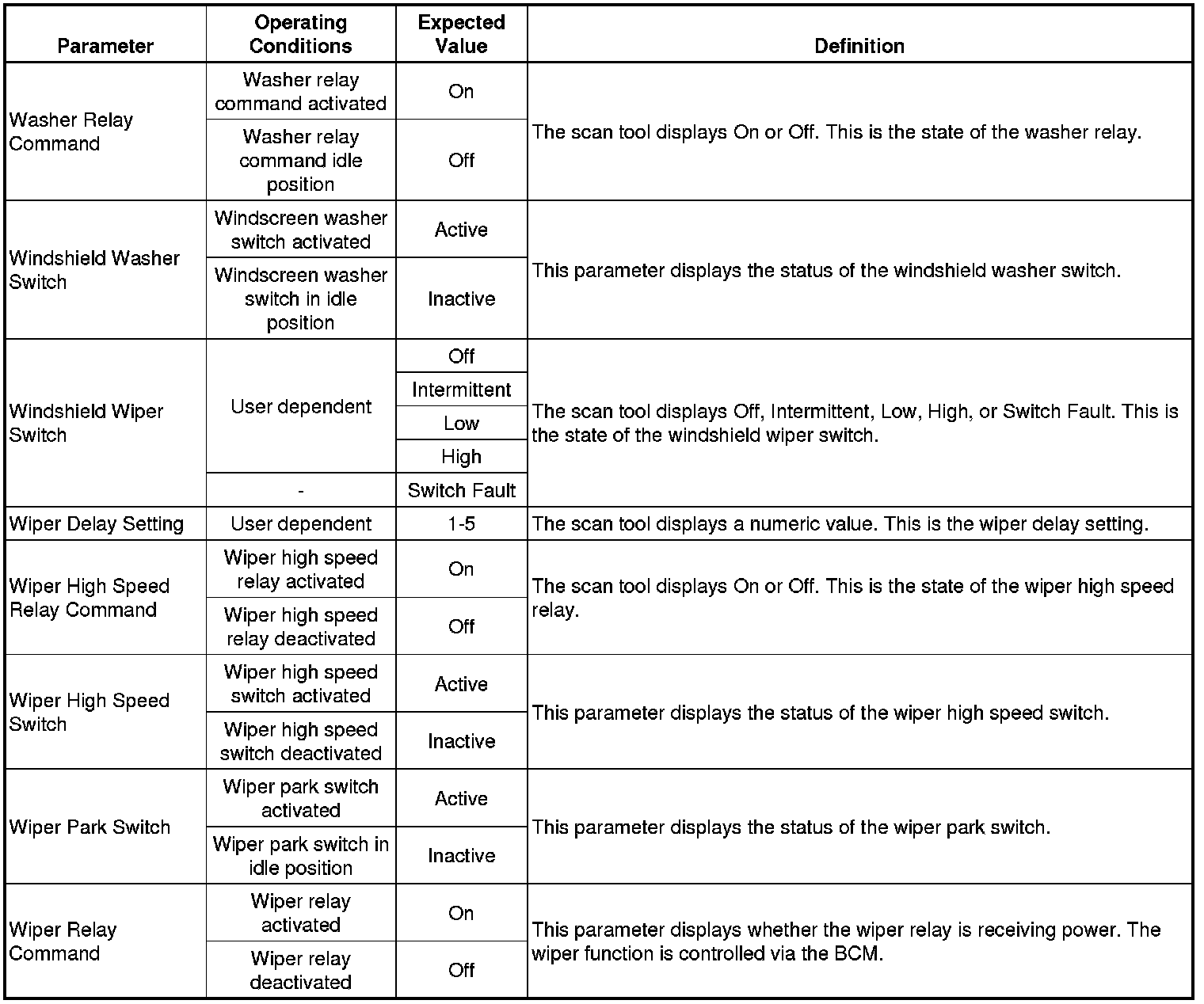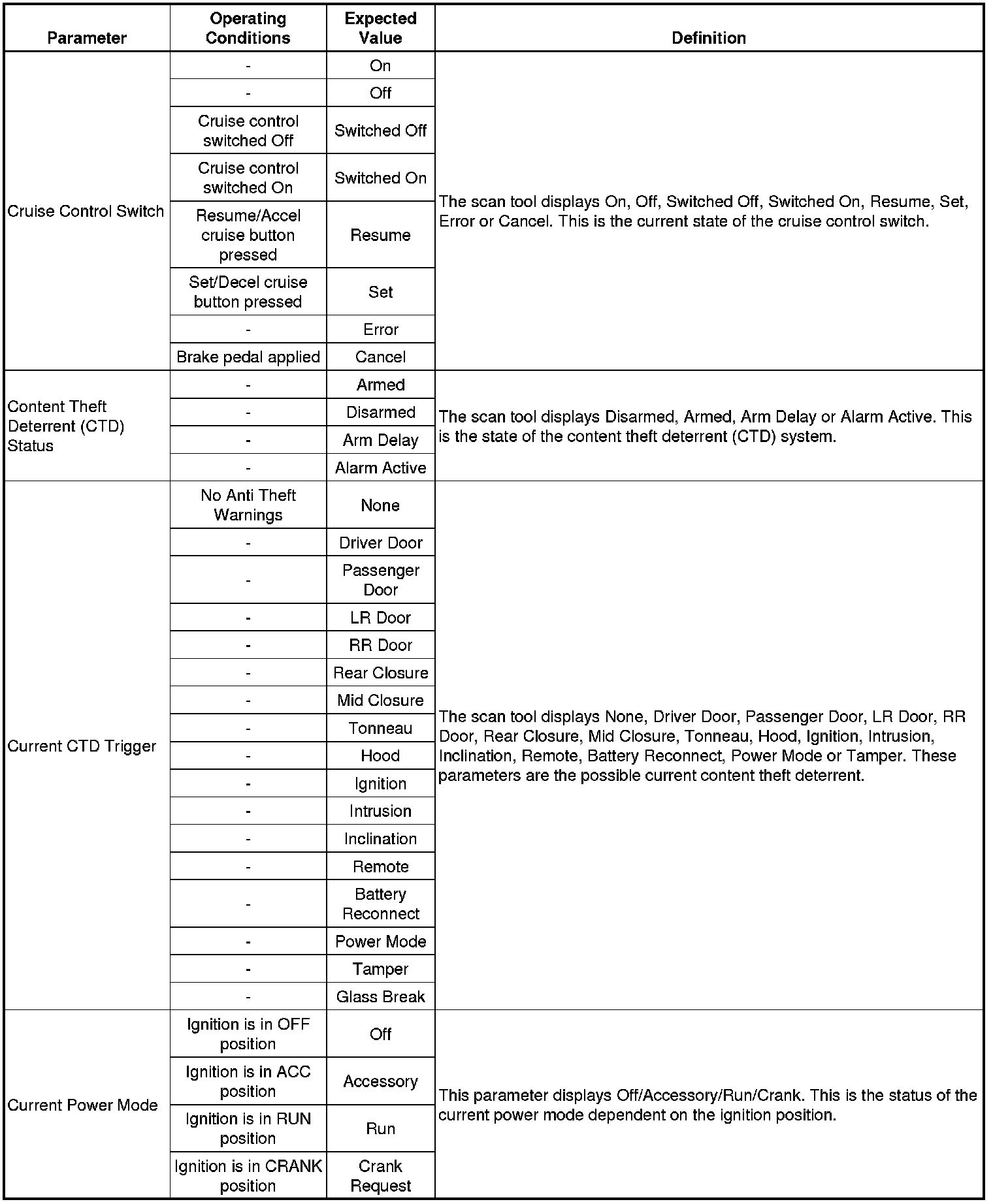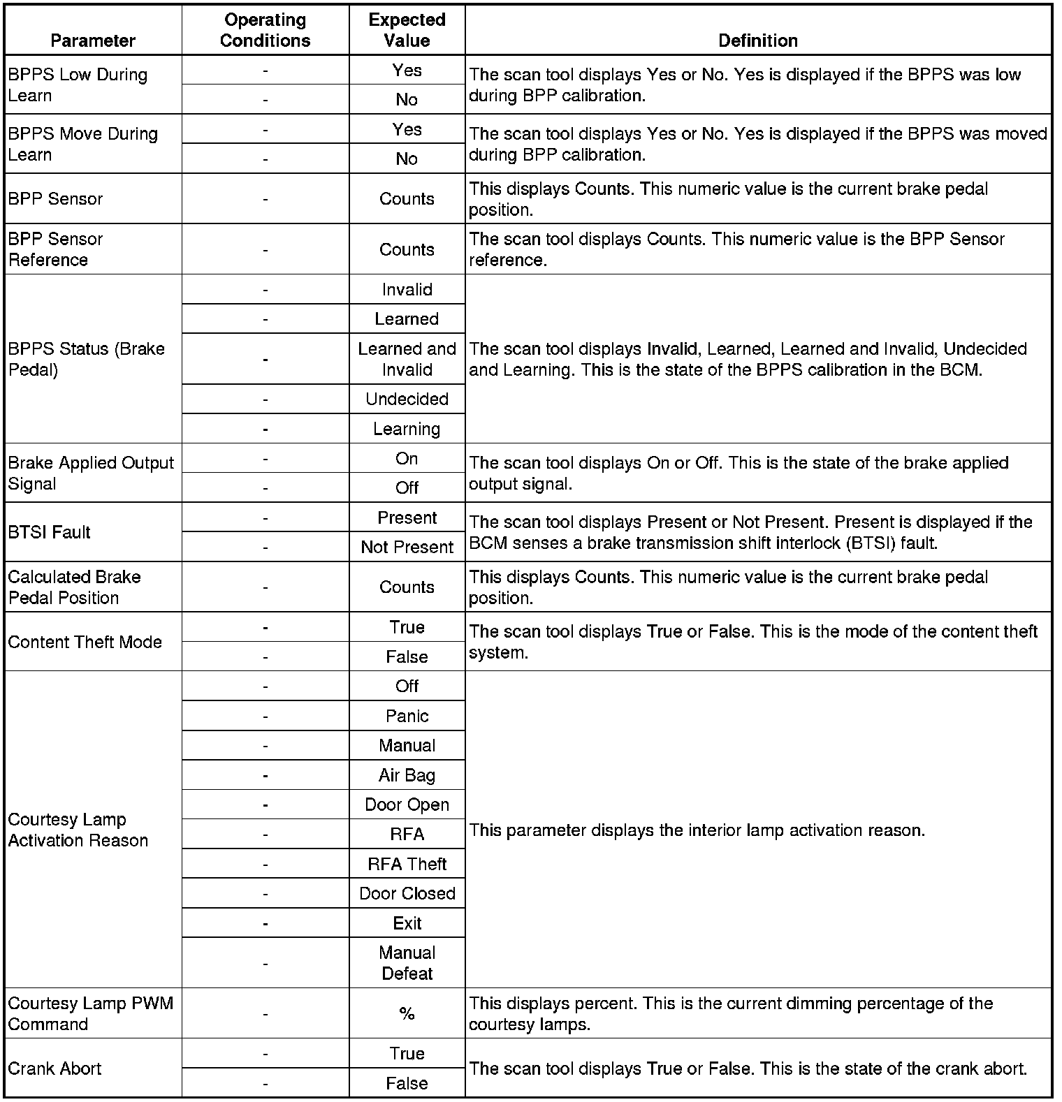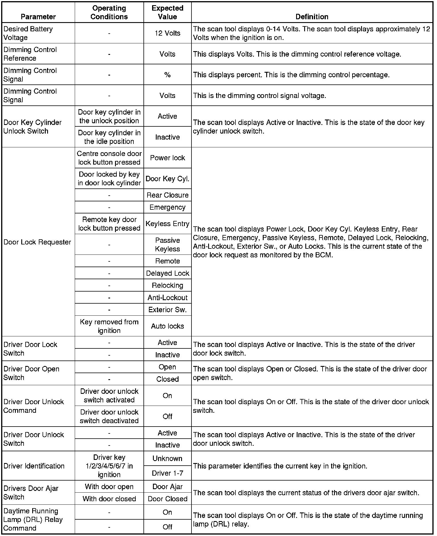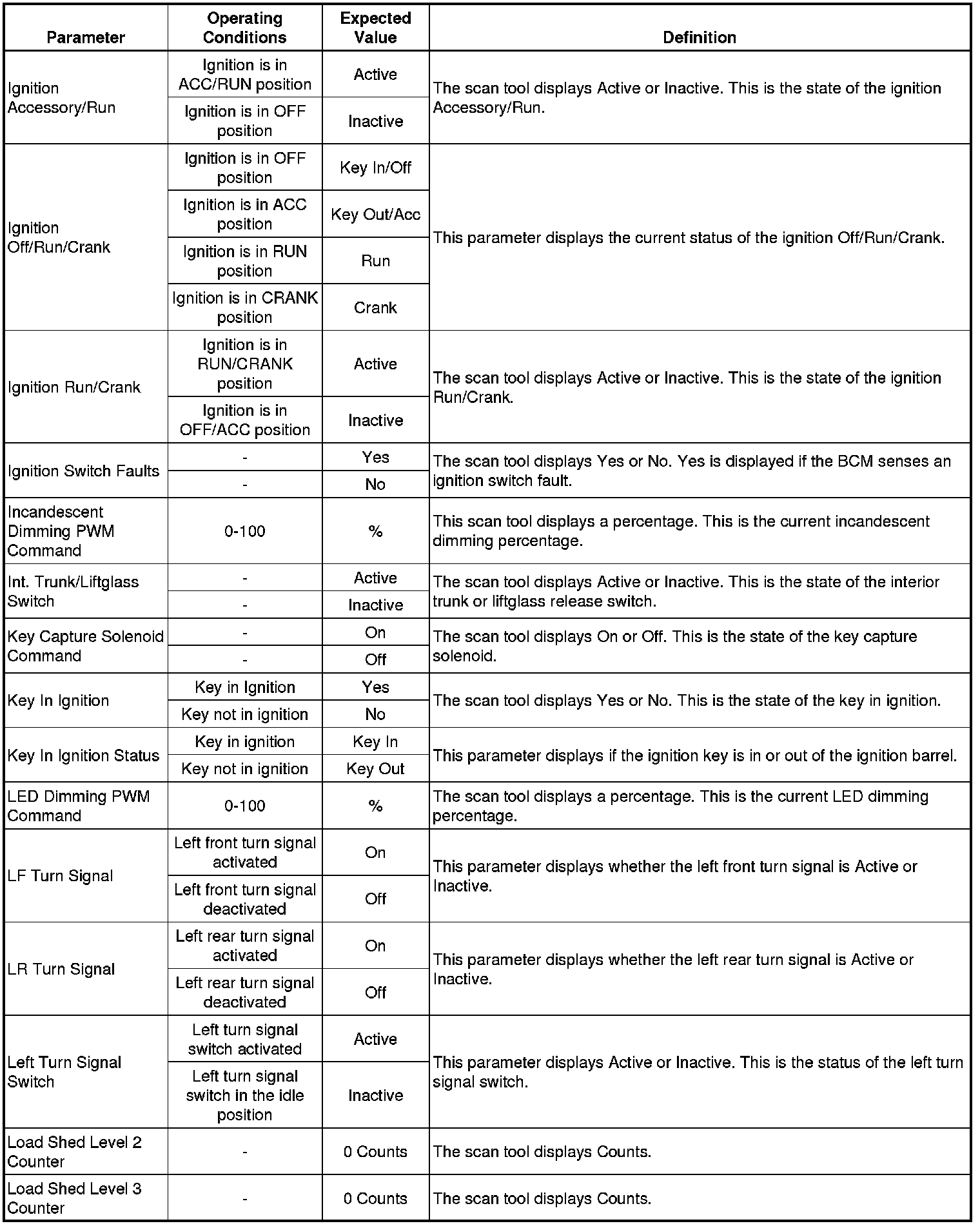 Body Control Module Scan Tool Data Parameters
