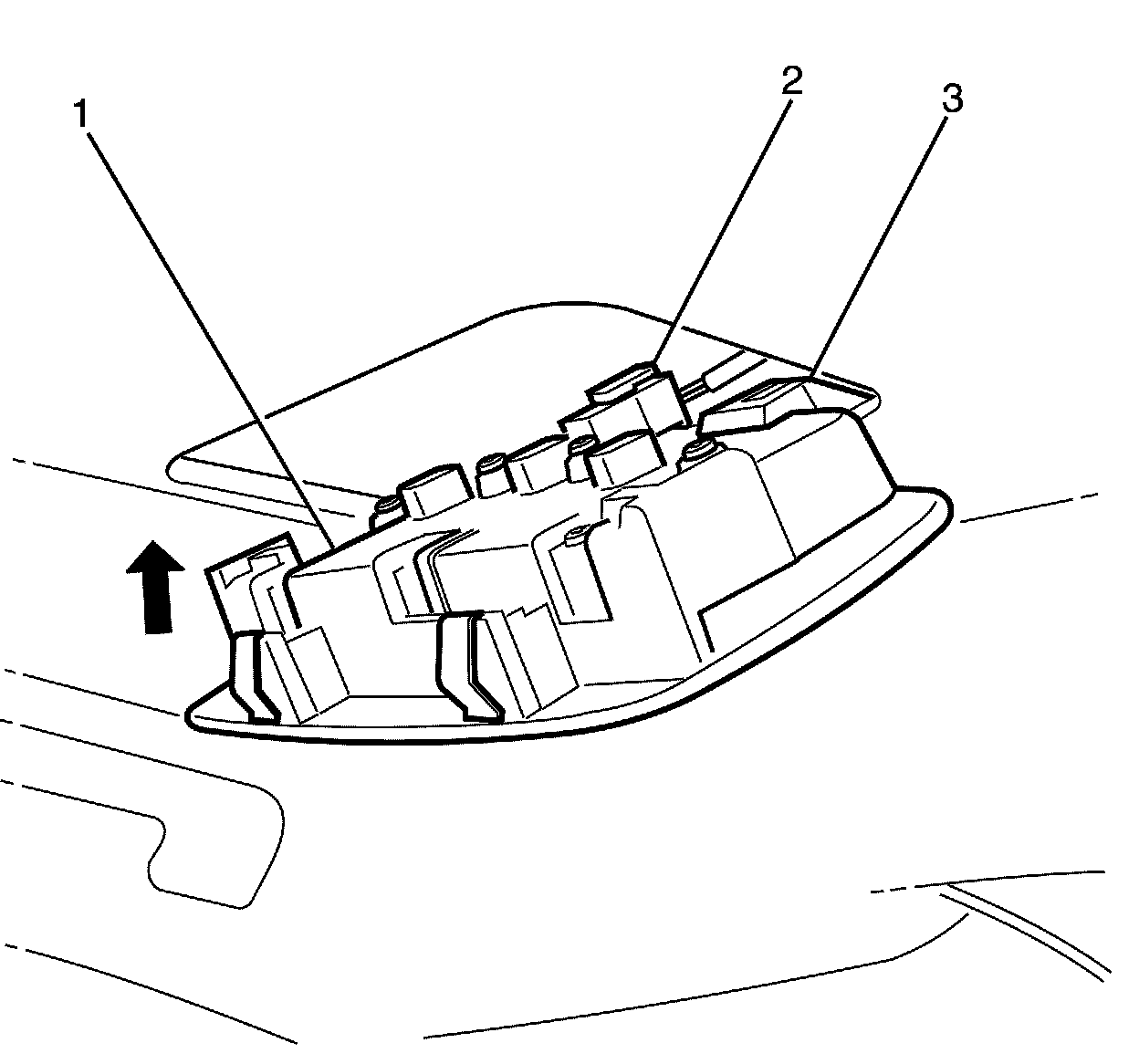 Pivot the dome lamp assembly (1) away from the headliner and pull forward to clear the rear locking arms (3).
