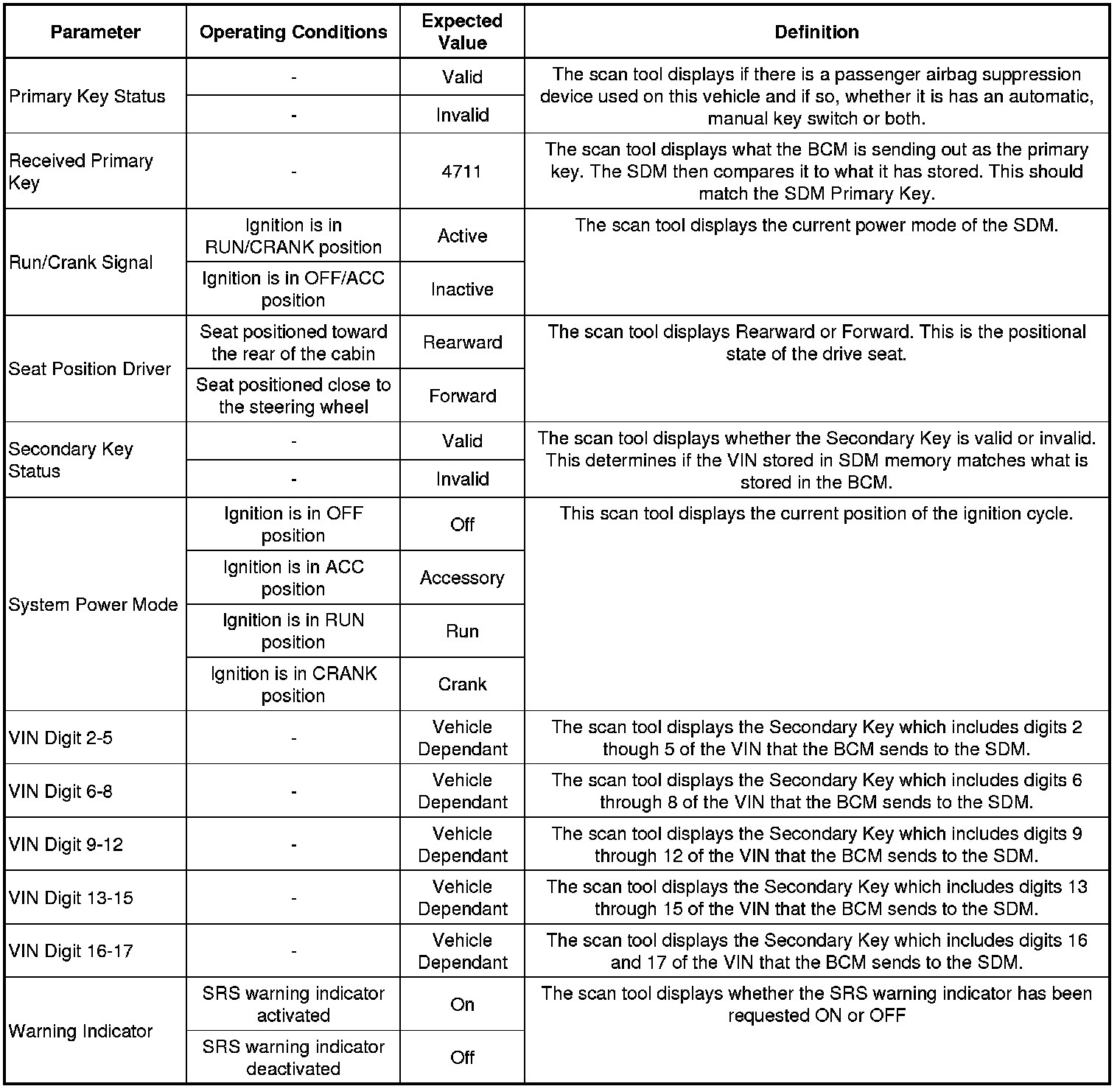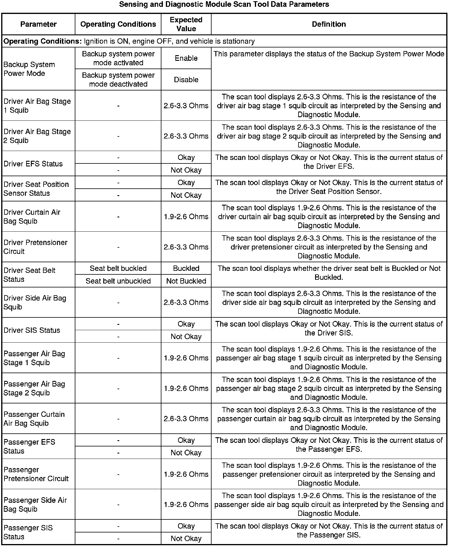 The inflatable restraint sensing and diagnostic module (SDM) scan tool data list contains all the restraint system related parameters that are available on the scan tool. The parameters in the list are arranged in alphabetical order.
