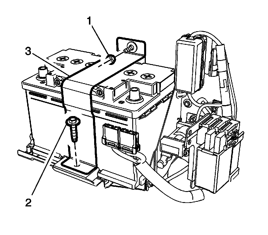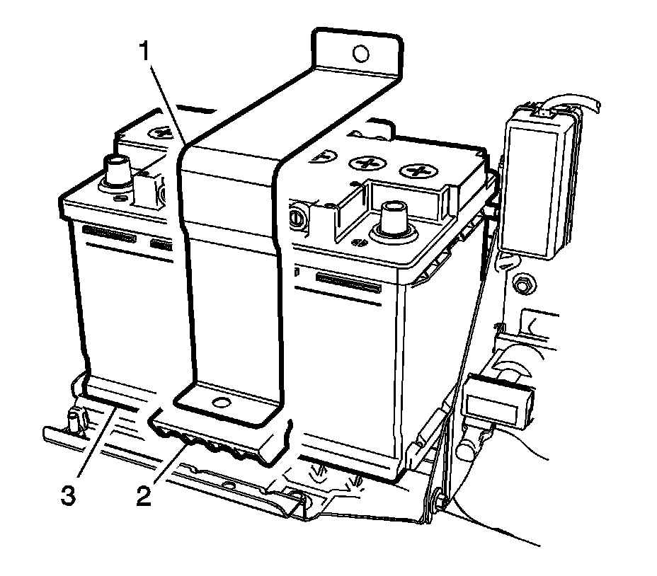 1. Install the auxiliary battery (3) with the hold down retainer (2) and the auxiliary battery tray bracket (1).