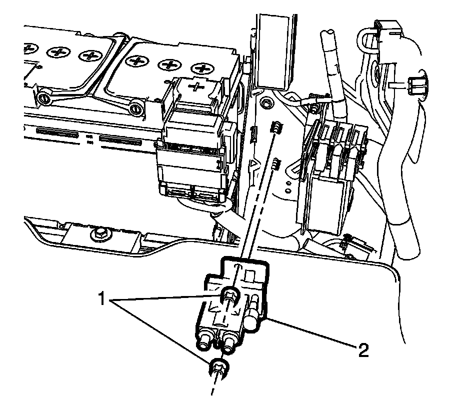 7. Remove the battery isolator mounting nuts (1) and the battery isolator (2) from the rear compartment area.