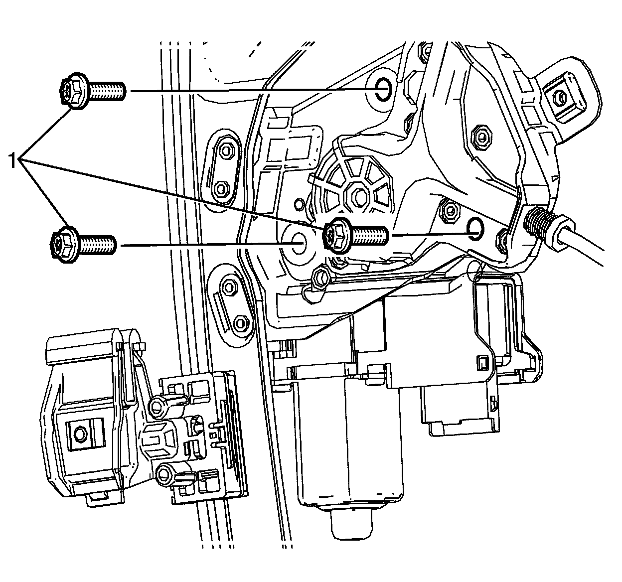 5. Remove the window regulator motor to window regulator retaining bolts (1).
