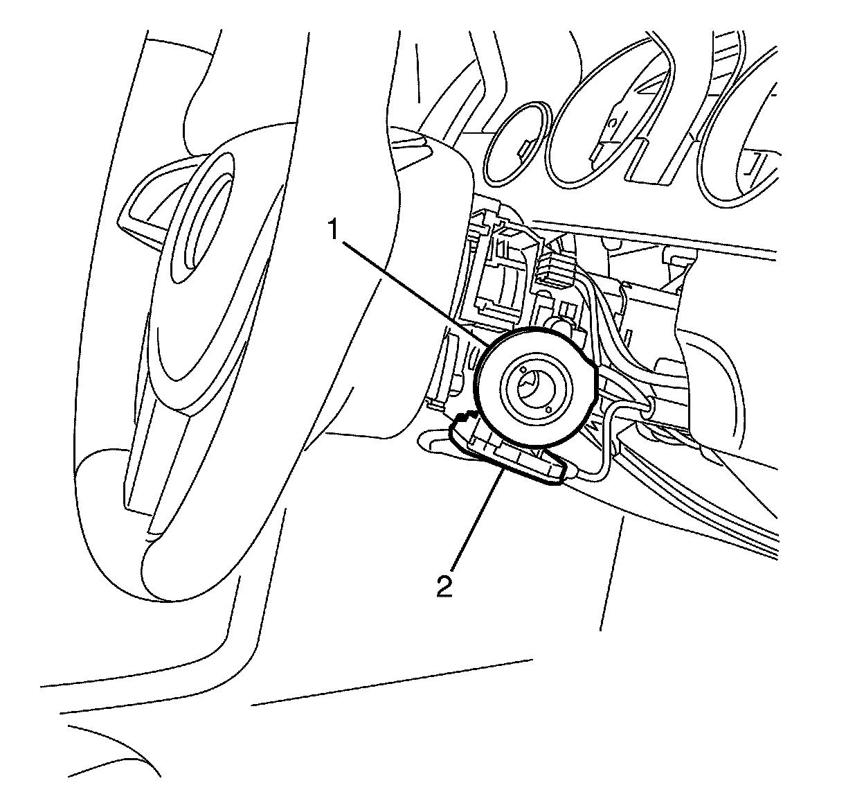 Make sure the locating pin on the steering column assembly (2) is aligned with the TDM (1).