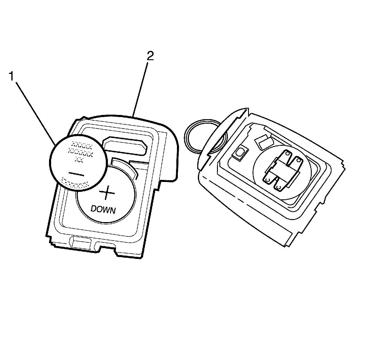 1. Install the transmitter battery (2) inside of the transmitter case (1) with the positive (+) side down.