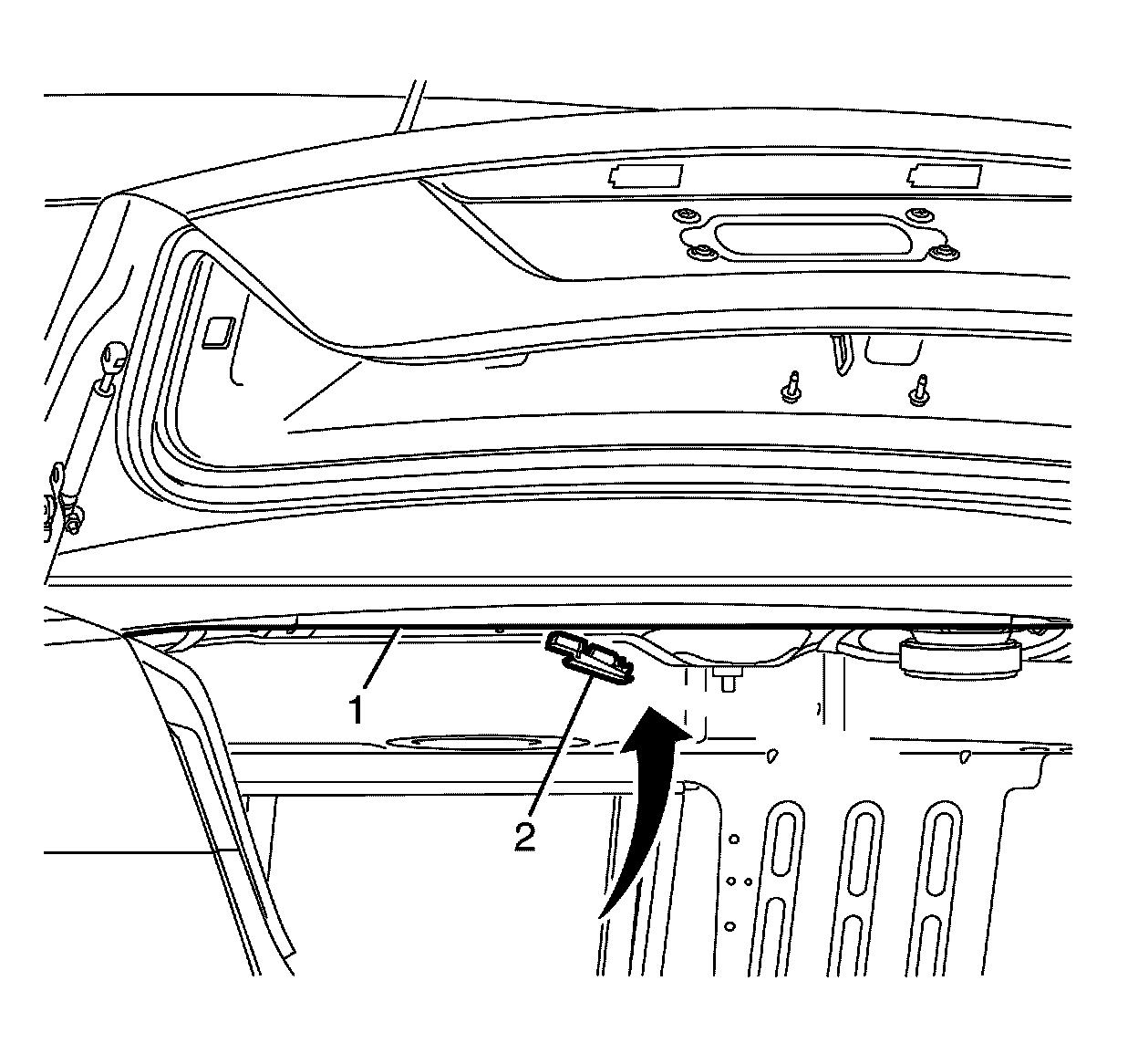 2. Install the rear compartment lamp housing (2) by pushing wiring and connector of lamp into the rear shelf (1) cavity. Snap lamp into position.
