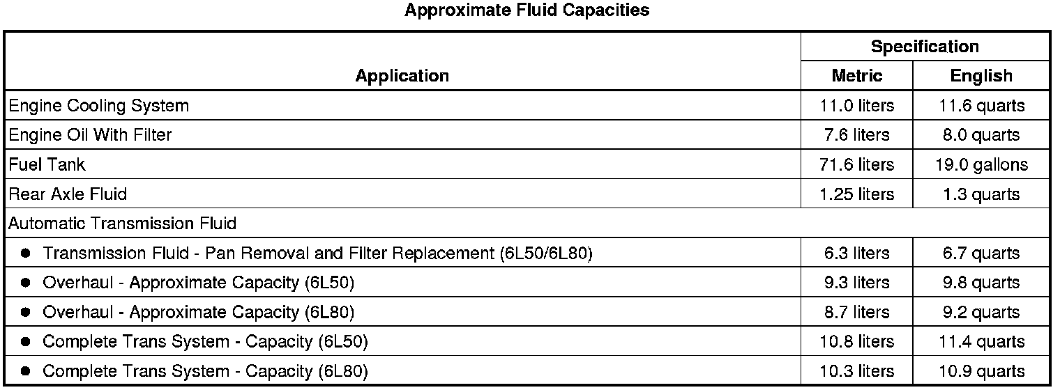 The following approximate capacities are given in English and metric conversions. See Fluid and Lubricant Recommendations Specifications for more information. All capacities are approximate. When adding, be sure to fill to the approximate level, as recommended in this manual. Recheck fluid level after filling.