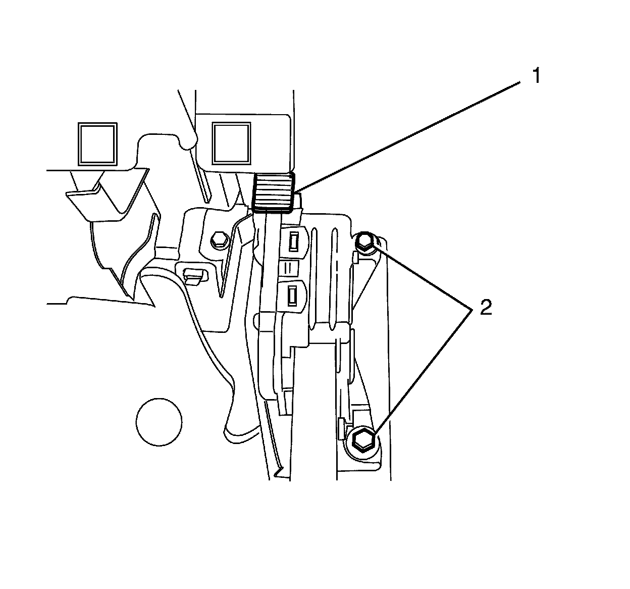 2. Install the accelerator pedal to steering column support bracket retaining bolts (2) and tighten to 9 Nm (80 lb in).
